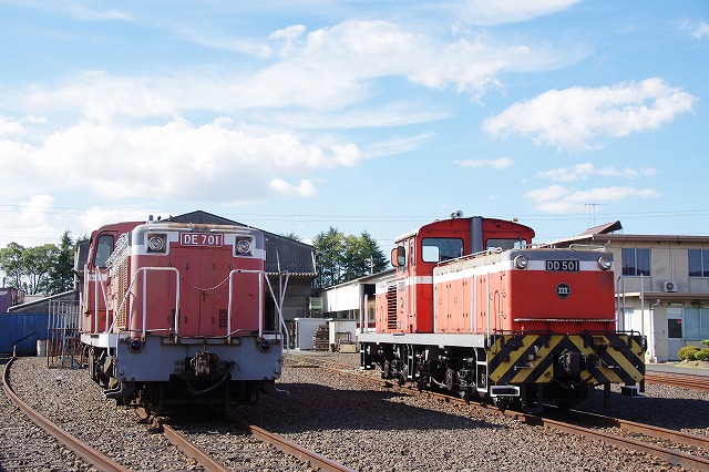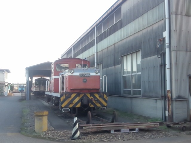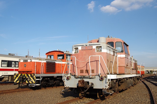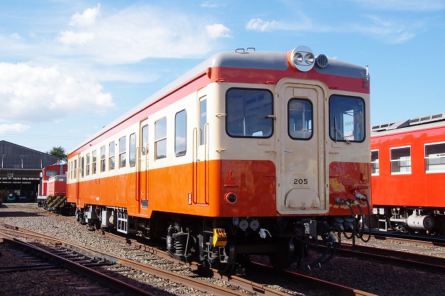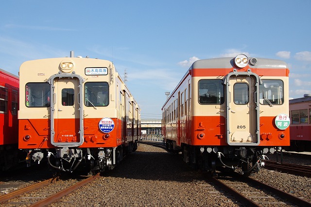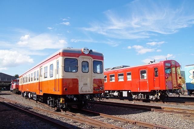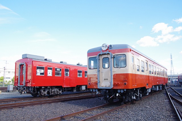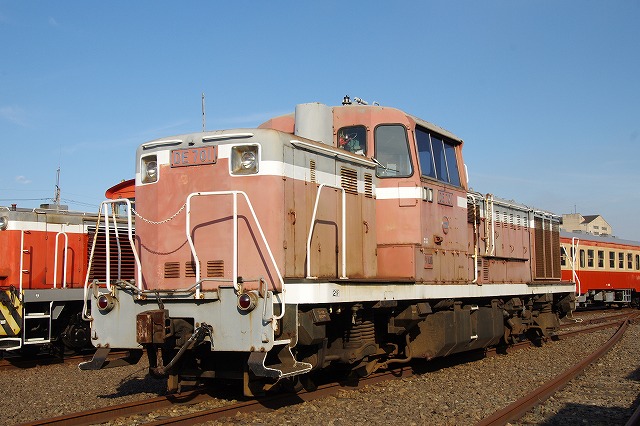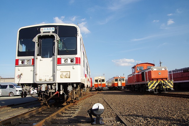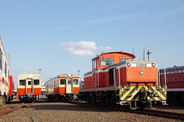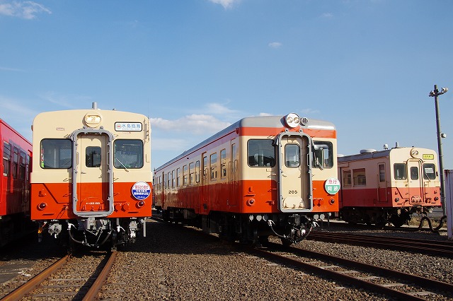 | 倉敷市駅で折り返し、往復1時間のショートトリップを終えて倉敷(タ)駅14:29着。ヘルメットを被り、乗降台から降車して、撮影会その2スタートだ。水臨の国鉄型キハ3並び(キハ205・キハ30-100・キハ37-103)とDE701・DD501の並びを堪能する。 |
