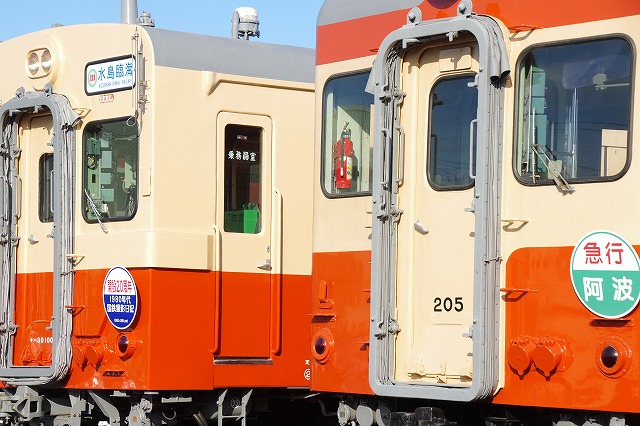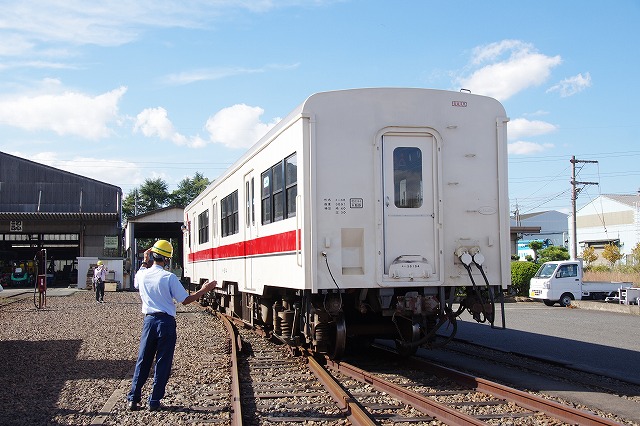 | 朝からの381系国鉄色やくも号撮影を終え、倉敷駅から倉敷貨物ターミナル駅(以下:倉敷(タ))へ向かった。参加者の集合時間前の12時に到着し、水島臨海鉄道(以下:水臨)の担当者と打合せを行った。持参のHMは、取付具を固定していなかったので、水臨のストックHMを参考に準備をした。キハ30に取付けるとバッチリだった。さらにHM業者さんからプレゼントしていただいた、阿波マークも同様に準備していると、倉敷市発三菱自工前行の入庫車両が12:35に到着した。洗浄線の踏み台から参加者が降りてきて、ヘルメットを被り、撮影会その1をスタートした。 |