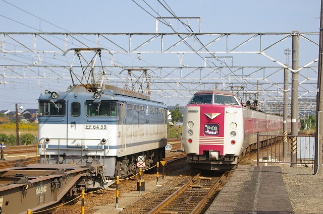 12:31 上り貨物 EF64 59を上り特急やくも 381系が追い抜く |