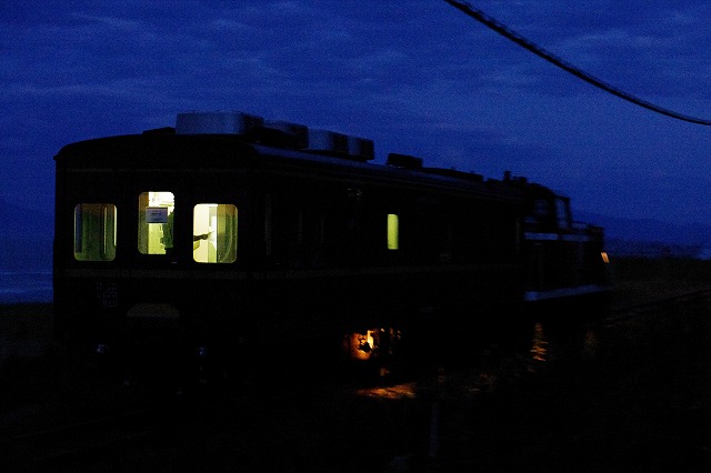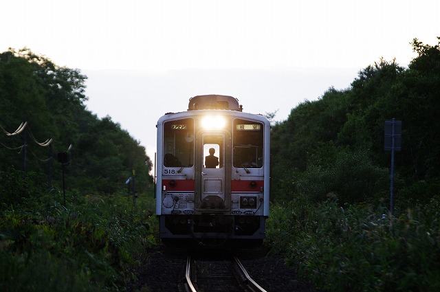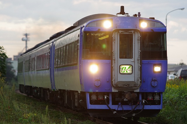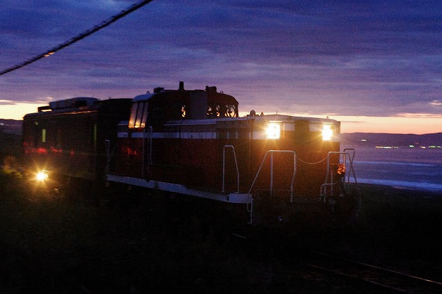 網走駅にもトップグループで到着できて、機回しをバッチリ見学できた。折返しまで4時間あるので、お土産を買ったり、石北本線のキハ183・キハ40を撮影した。上りは日没後の発車なので残照区間の一発勝負だ。北浜駅付近は展望台に早い時間から置き三脚などがあったので敬遠し、その手前の国道の歩道脇から撮る。みるみるうちに暗くなり、それに合わせて感度を上げるが、もう限界ってところでライトが見えてきた。一台は三脚にセットしISO6400で1/200、もう一台はISO3200で1/60で流し撮りにした。マヤ34-2008の床下にある点検灯(って言うのかな?)が光っているのが印象的だった。