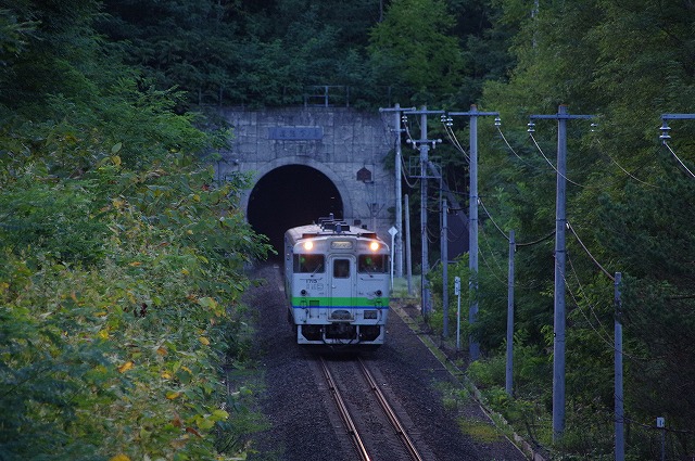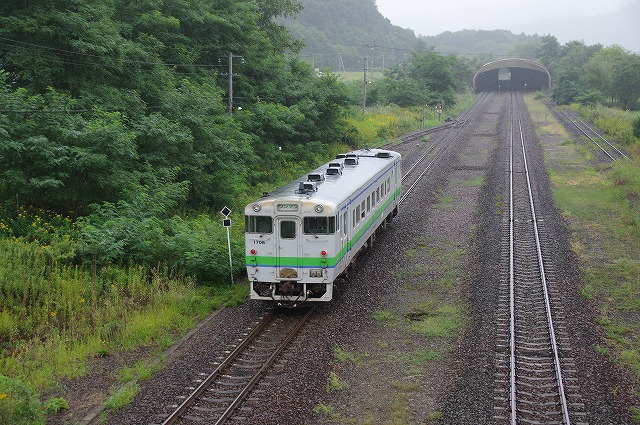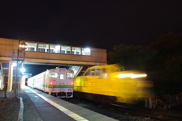 東に向かうにつれ雨の頻度が上がってきたので屋根のある滝ノ上駅をスタート地点にする。コンビニで買ったザンギ丼を食べて待つ。前走りのキハ40単行鈍行で練習した後、ロイヤルエクスプレスが通過。DE15の黄色さが鮮やか過ぎて、いやはや・・・。即撤収し高速経由で追っかけ開始。トマムICで降りて串内信号所へ、20名程がスタンバイ、幸い雨は止んでいた。低速で進入してきた。交換のため停車するが、私は直ぐに出発し、再び高速に乗る。 |