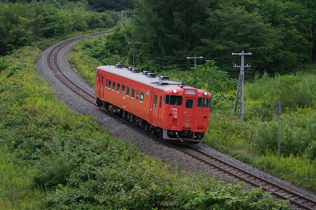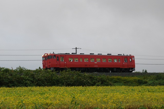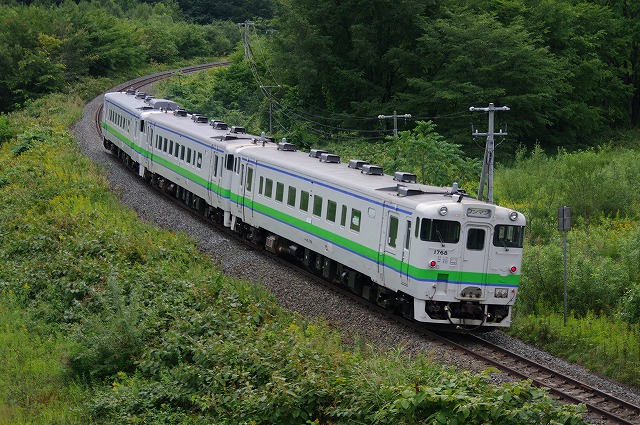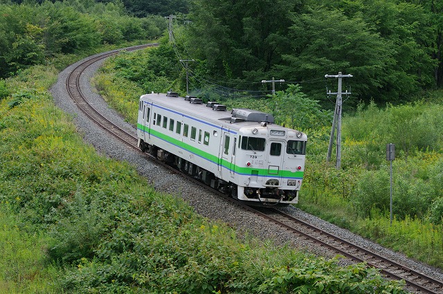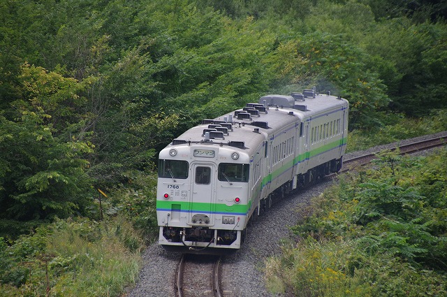 続いて、遠軽駅の跨線橋へ行くか迷ったが、混んでいそうなのでパスして、遠軽の先で待つ。この区間も草ボウボウだったが、ましなところを見つけた。これを撮って本日のロイヤルは終了し富良野線へ向かう。自動車専用道に入り、レンタカーの燃料を確認すると、残りの走行可能距離が45キロと上川に行けるか行けないかギリギリのところだった。今さら降りてもGSなど無いので、一か八かの勝負にでる。結果、上川まで逃げ切り、一旦降りて近くのエネオスへ。28.5リットル入りヤバイところだった。寄り道したが、美瑛には15時前に着き、日暮れまでノロッコを撮影し、富良野で根室本線のフラノラベンダーエクスプレス4号とキハ40を撮って撮影終了。美瑛でジンギスカンを食べて白金温泉へ向かった。 |