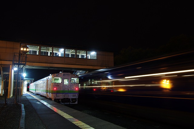 芽室ICで降りて大成駅付近の陸橋へ。本日最大の人出で80名程度。ただ、広いポイントなので圧迫感なし。薄日が射したり雨が降ったり天気は目まぐるしく変わり、通過時は最悪の小雨模様だった。ロイヤルエクスプレス通過後に貨物が来るのでそのまま待機してから出発した。帯広駅で十勝帯広名物ぶたはげの豚丼を仕入れて池田町を抜ける。相変わらず天気が悪く、かなり暗くなってきたが、無理やり高感度撮影を2発して残りはバルブの部へ。 |