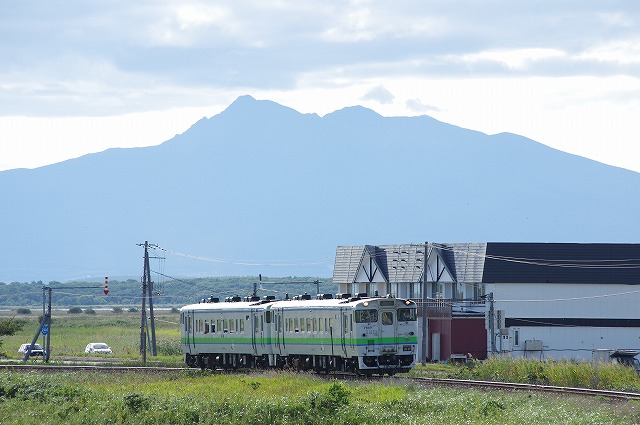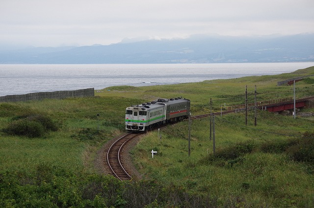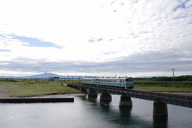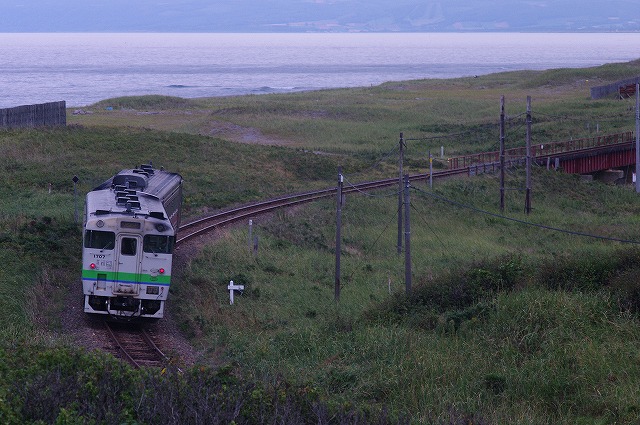 | 5時に起きて、網走のB&Bを出発し北浜へ向かう。やっと朝から晴れてひと安心。すでに数多く撮った写真が発表されている展望台ではなく、その先の鉄橋を目指す。撮影者も多いが釣り人も多い、鮭を狙っているらしい。振り返りで昨日残念賞だった斜里岳も絡められる良いポイントだ。送り込みの回送は、ついでにギラリもゲット。気を良くし、折返しの客扱いもここで撮る事に決定。近くのセイコマヘ行って、朝メシを仕入れてのんびり3時間過ごす。キハ40も1本撮れてまずまずのスタートだ。 |