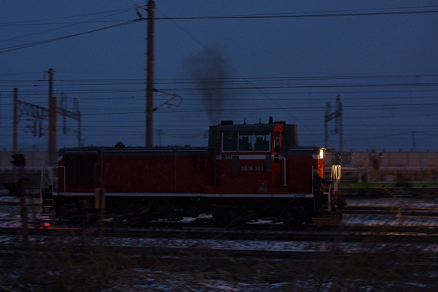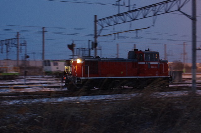 八戸貨物の入換は真っ暗なので感度を上げて流し撮りで。18時前まで粘って終了。近くの日帰り温泉で冷えた身体を温めたあと、せんべい汁などで夕メシ。予定では明日昼まで八戸三昧の予定だったが、天気予報など検討した結果、弘南ラッセルが走りそうな気がしたので、弘前へ向かった。