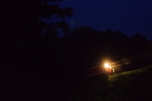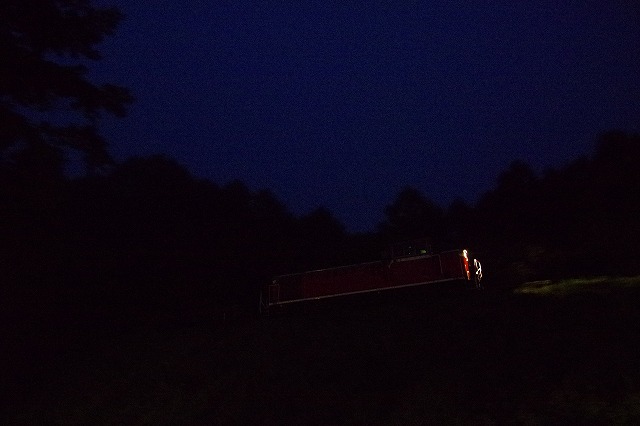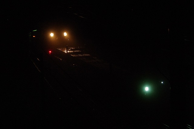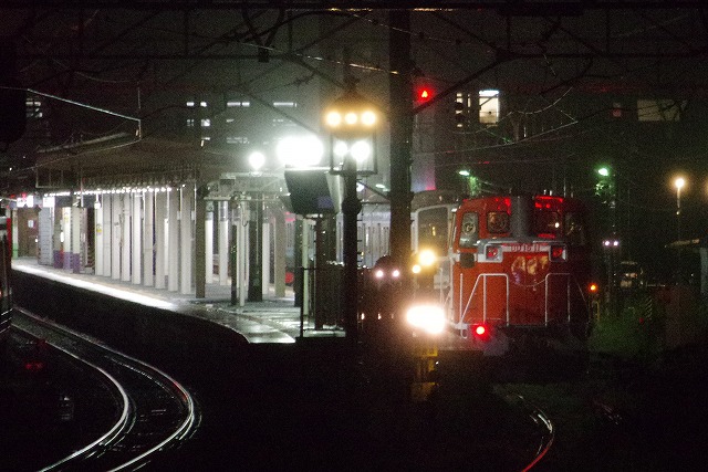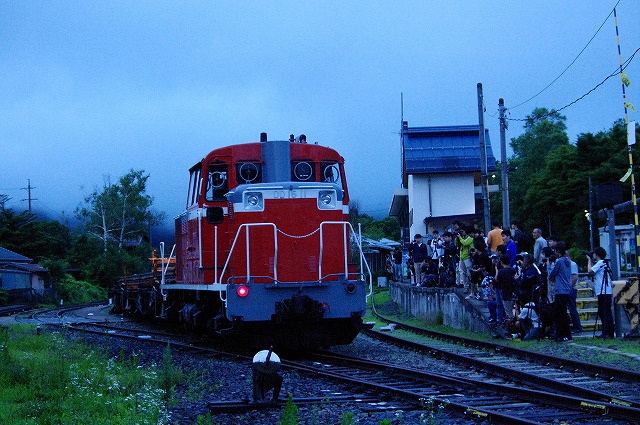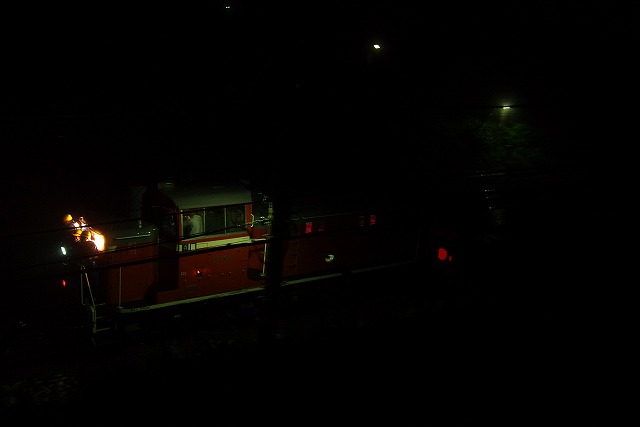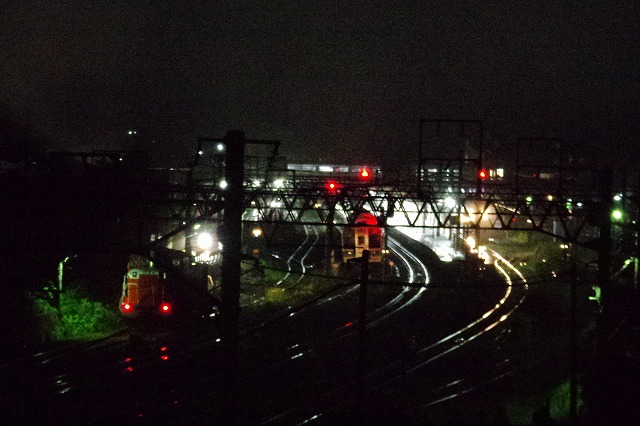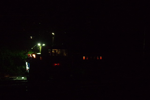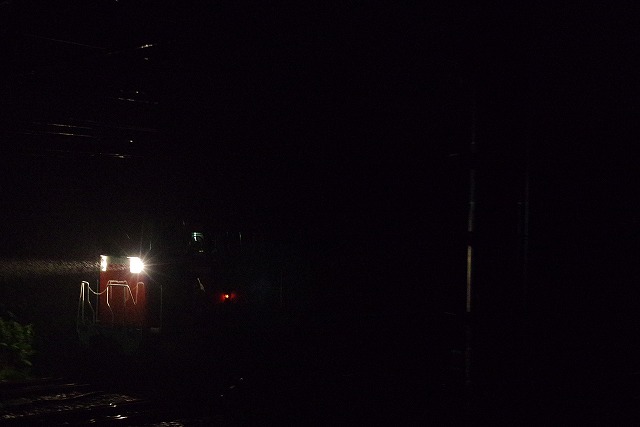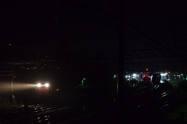 | 紀伊半島に台風が接近する悪天候と、工臨ブーム?で混雑が予想でき、直前まで出撃を迷ったが、最後の運転なんて噂もあり、後悔の無いように22時過ぎに家を出た。野辺山工臨は4年ぶりだ。雨が降ったり止んだりのなか夜中の20号線を走り、小淵沢に2時過ぎに着いた。駅裏は混雑しそうなので、松本方の陸橋が様子を観察することにした(・・・ので、真っ暗な中の撮影になった)。入換が始まる頃雨が強くなり、びしょ濡れで撮影。追っかけた先の野辺山駅には50名ほどがホームに集結、側線側は3名だった。 |