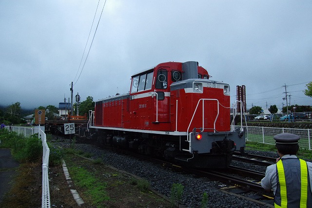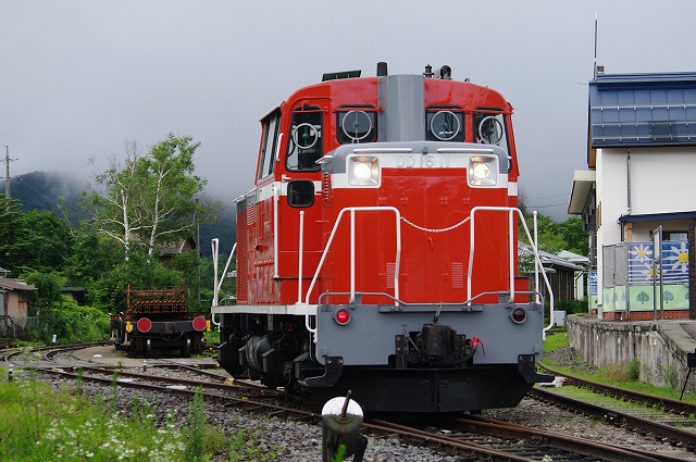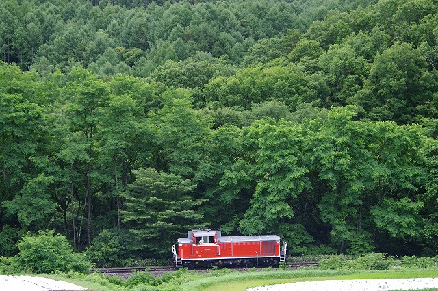 回送まで時間があるので、車内で仮眠する。夜が明けたが晴れず曇ったままの6時半、機関車に動く気配が。車外に出てカメラを構える。6:45に入換が始まり、1番線へ。下り方面に先回りして待つ。高原野菜越しの森バックポイントでサイドを撮影し終了。雨が強く降ったり止んだりするなか、下道で帰った。 |