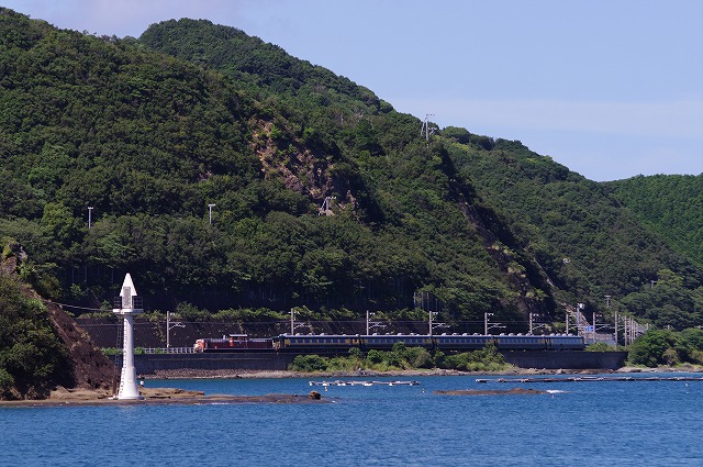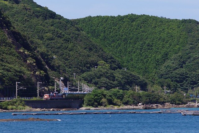 1804だった。DF200の200番台も2本初撮影できた。R42と高速を使って南下した。昼頃に紀伊浦上に到着し、磯で子供を遊ばせながらサロンカーなにわを待った。このエリアだけか撮影者が少なくてビックリ。串本の停車で追い越してもう一発。突っ込んではいけないところだが、電化記念列車をディーゼル機関車牽引・・・