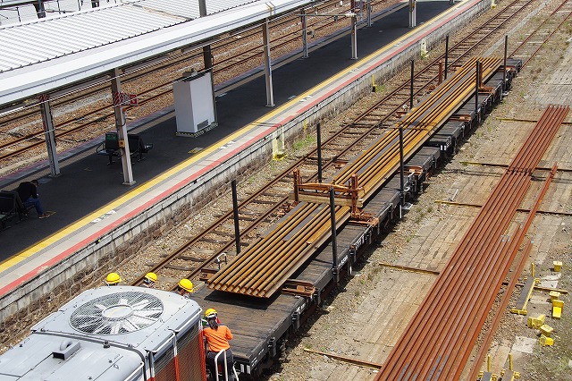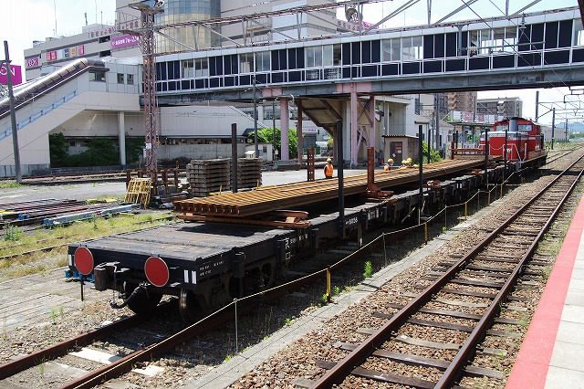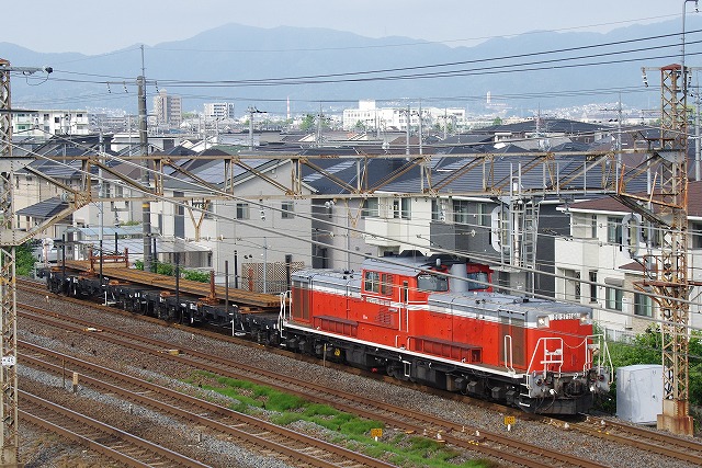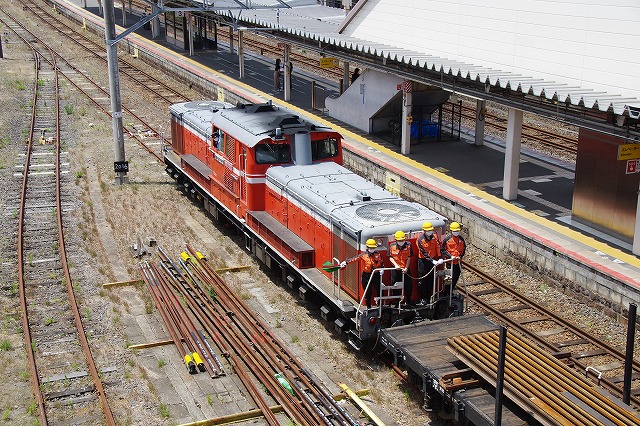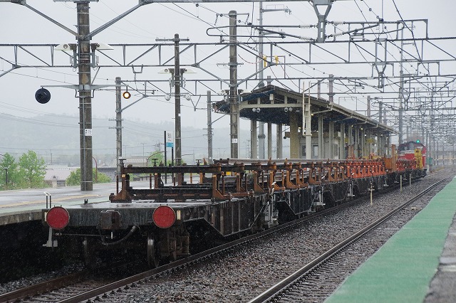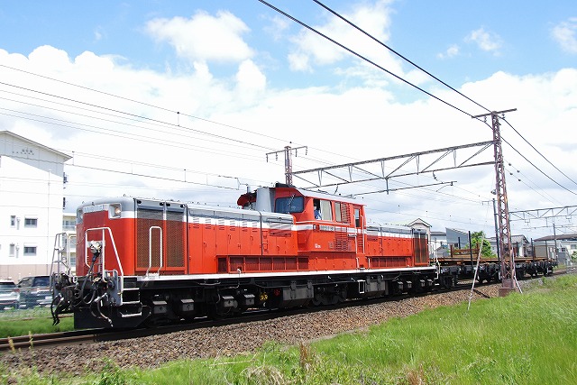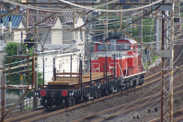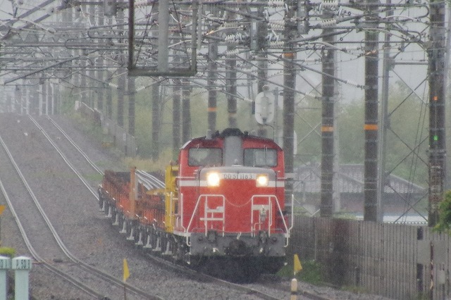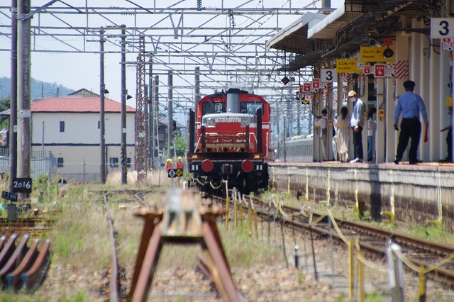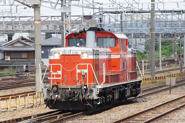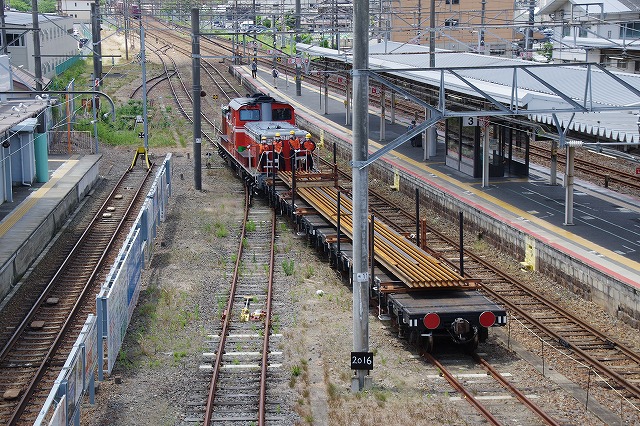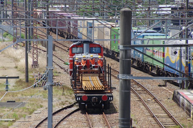 近江八幡の米原方で待っていると、陽射しが強くなってきて暑い。工臨が低速で到着したのでダッシュで駅へ戻る。跨線橋から推進で入って来るところを狙う。DD51のデッキに4人も乗って入換をしていた。すぐにホームに降りて、解放シーンを撮影。DD51が放れてこれで終了と思った「ピッ!」と汽笛が鳴り、またバック。どうやら新人の入換訓練のようだ。先生らしき人が手本を見せて、そのあと数回切ったり付けたりを繰り返していた。DD51が側線の先の方まで入れ換えて訓練終了。回送を撮るため先回りする。 |