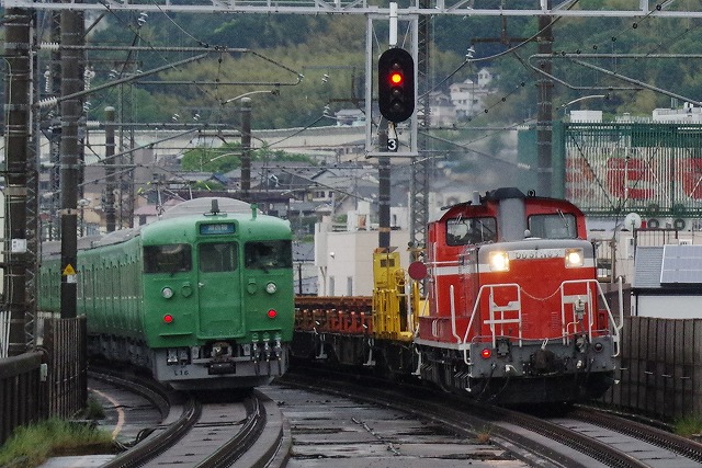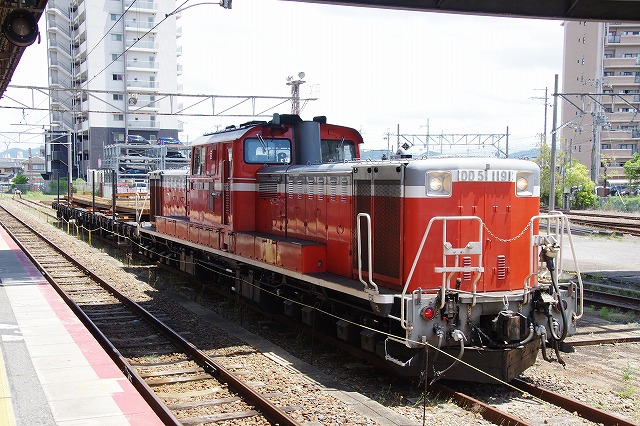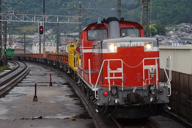 土日にDD51工臨の運転があり京都へ。15日土曜日の運転は、向日町発の近江八幡工臨。この列車は近江八幡を通過し、一旦米原まで行き機回しして、近江八幡駅下り本線から推進で側線へチキを押し込む運転形態だ。まず上りは停車時間のある草津駅前後で撮影した。駅そばの麺屋で鶏天そばで朝メシにして近江八幡へ。 |