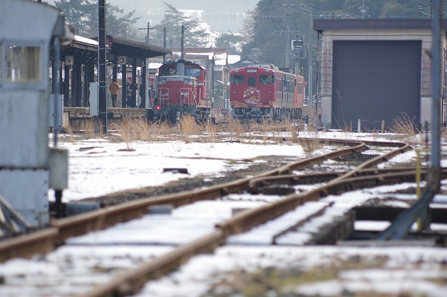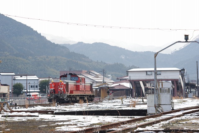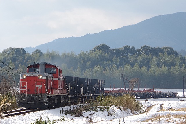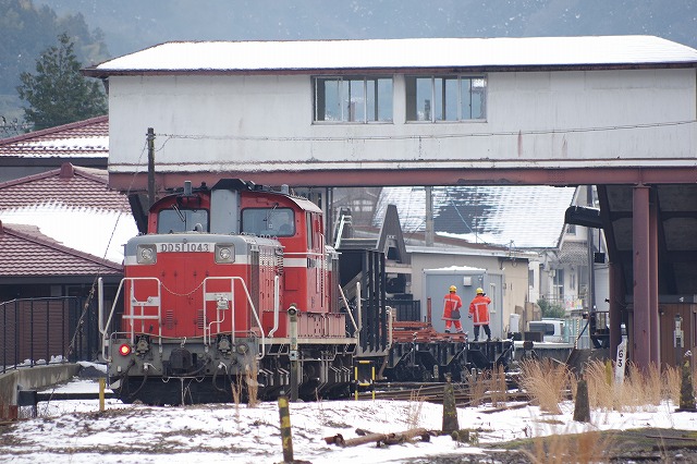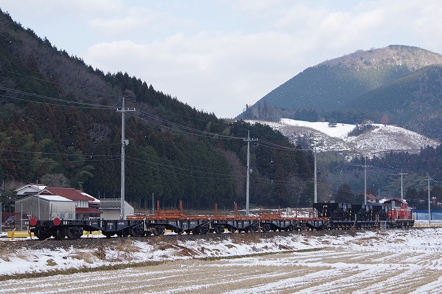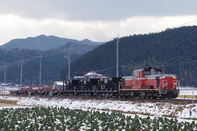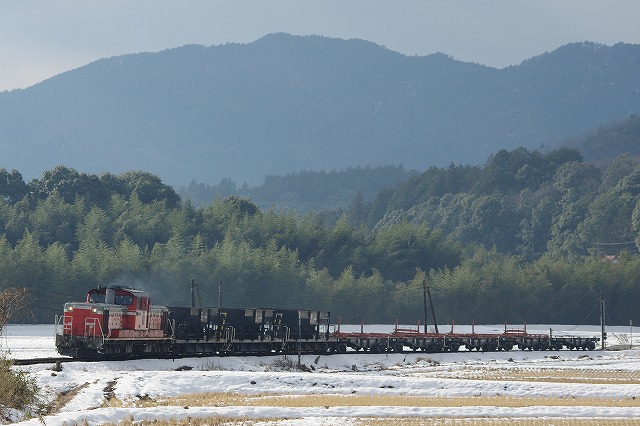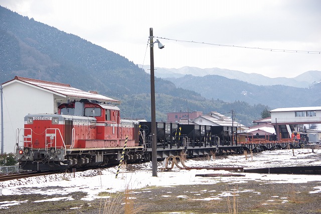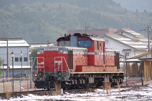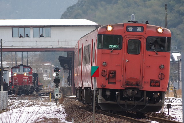 午前中は雪景色の徳佐付近でキハ40を撮影し、昼前から仁保の手前で待つと撮影者1名。話をうかがうとDD51の可能性濃厚。予定時刻にダイヤ通りDD51+ホキチキで通過。津和野まで追っかけ開始。2発目は珍しい編成が分かるように38年ぶりに(入社した年以来)名草〜地福を目指す。ここは撮影者0名、珍編成で喜んでいるのは俺だけか?あとは成り行きで徳佐先のストレート(手前の徳佐の有名ポイントには30名以上いたので安心した)と津和野俯瞰で終了。