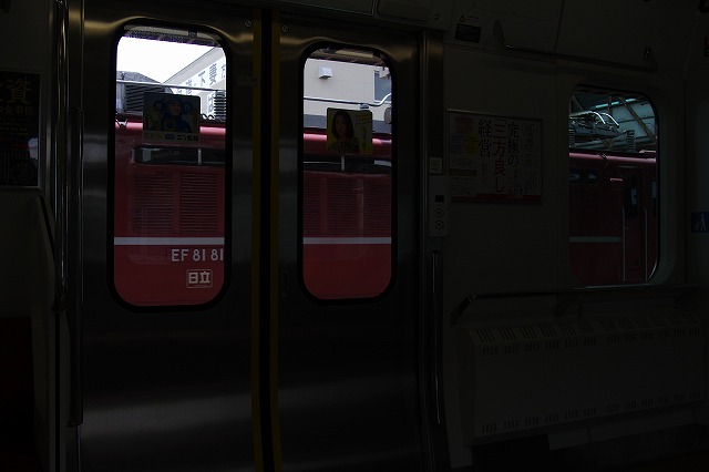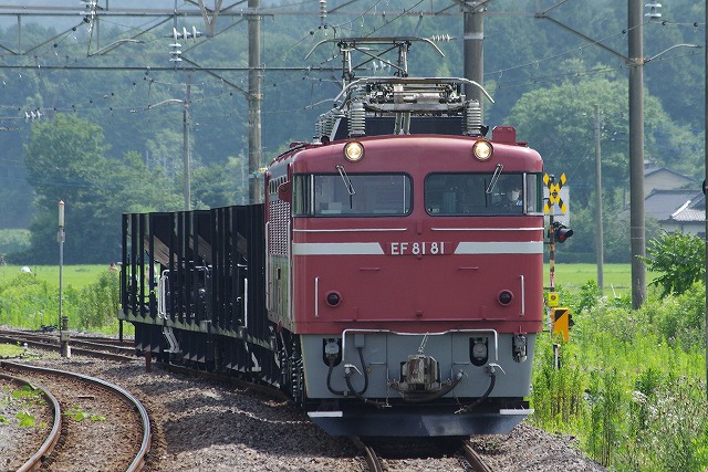 今回の回送はEF81 81充当と聞き決行。上野を7時発鈍行のグリーン車でチキン弁当を食べながら、リッチな気分で水戸線へ向かった。今回は駅撮りのためホームの具合を見ながら、福原で下車。強い陽射しを浴びて待つ。ここで鈍行と交換かと思ったら中線を通過して行った。続行の鈍行で追っかける。 |