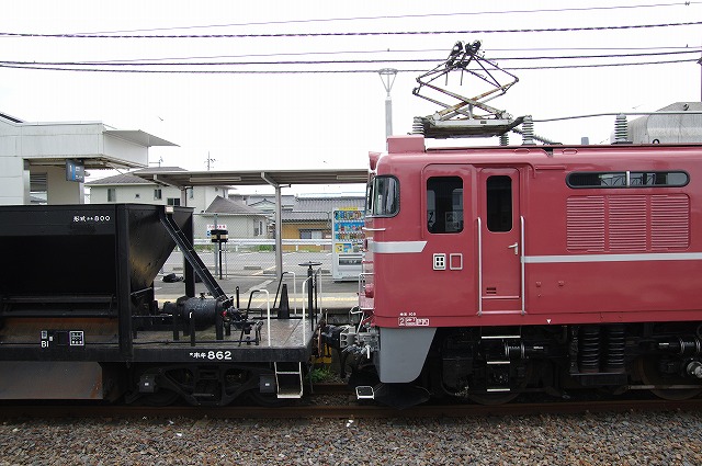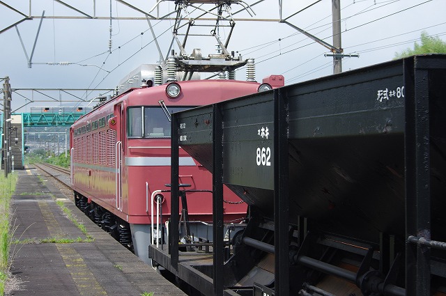 9730レ EF81 81+ホキ×4 停車中、ここで前パンを上昇 |