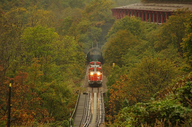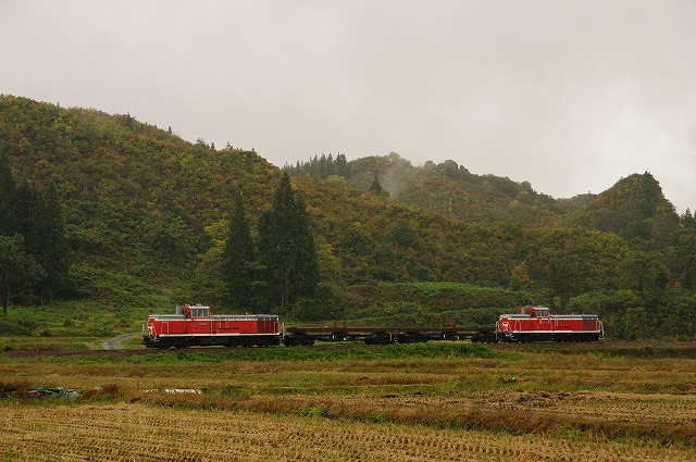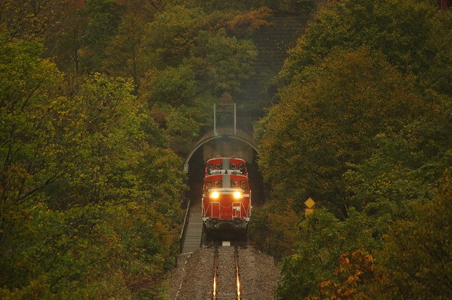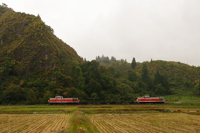 いつの間にか、毎年秋に恒例になっているMとのディーゼルネタ撮影旅行(釧網マヤ検山陰迂回貨物2019只見工臨)、今年は昨年に続き只見工臨。丁度良いタイミングで東京発GoToトラベルが始まったので、現地まで新幹線、そこからM運転の車のコース。東京6:08のとき301号で出発し長岡で乗換え、予報が大外れで雨ポツリポツリの東光寺駅からスタート。工臨通過後、田んぼで撮影していたMが駅まで迎えに来て出発。栃尾経由で一気に山越えして只見線へ。時々雨からずーっと雨になる。只見まで2発と見立てて、まず入広瀬手前で待つ。人気の線路寄りの踏切ではなく田んぼの中から狙う。こちらは貸し切り状態。追っかけ組が来るのと同時にDE10が低速で通過して行った。昨年は工事中だった六十里越峠も越えられるが、確実な峠手前の最後ポイントで上から撮影する。本降りになりびしょ濡れで往路終了。