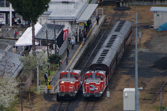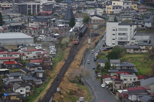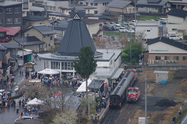 今回撮影のメインは、左沢駅での特殊な入換を見るための楯山公園からの俯瞰だ。ロケハンの成果で羽前高松駅から10分程で到着し、ベスポジを確保して望遠レンズで観察する。左沢駅は、側線1本で機回し用のエンドレール側のポイントが無いため、以下の手順で機関車を付け替える。@側線に復路用機関車が到着・待機 A本線(ホーム側)に列車(以降、客車と表記)が到着 B復路用機関車が入換え、本線の客車と連結 C客車から往路用機関車を切離し D復路用機関車が客車を牽引し、側線へ推進で推し込む E往路用機関車が回送で出発 ・・・という手順だった。小雨だったが興味深く1時間にわたる入換ショーを見学した。