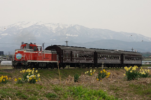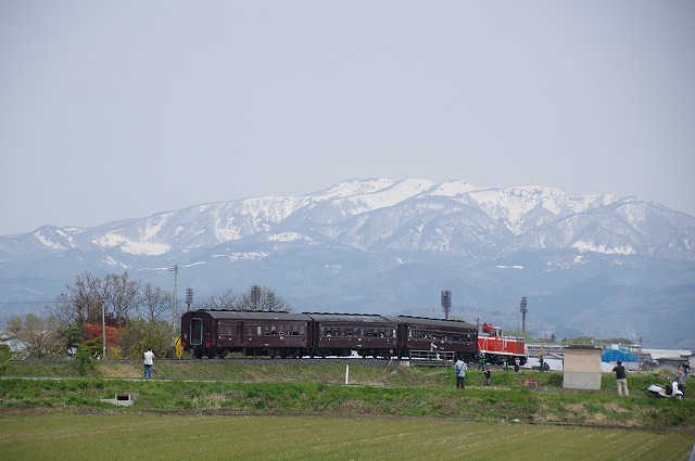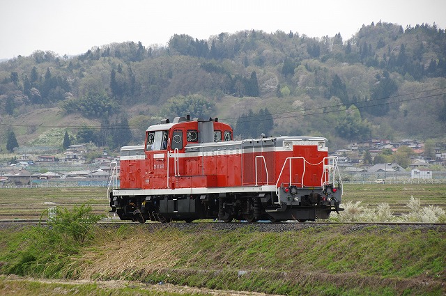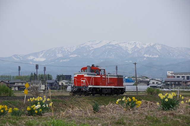 単機回送を追っかけして、コンビニで麻婆豆腐弁当を買う。羽前高松駅に戻り三脚をセットして、お花見しながら遅めの昼メシ。通過時にはここもホームも満員でお見送り。 |