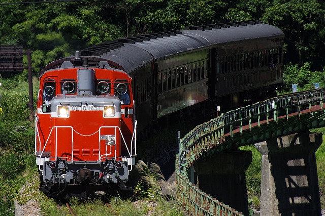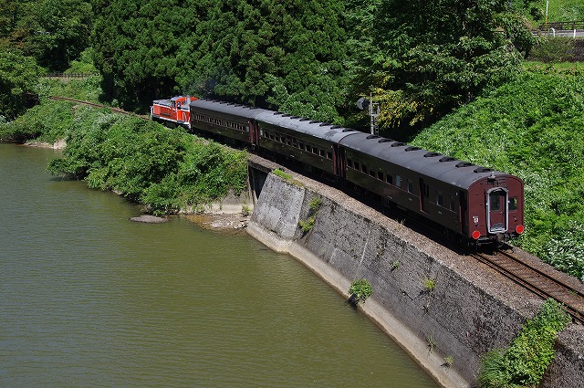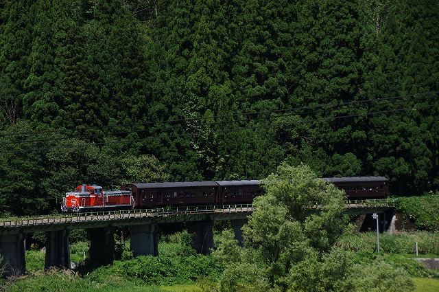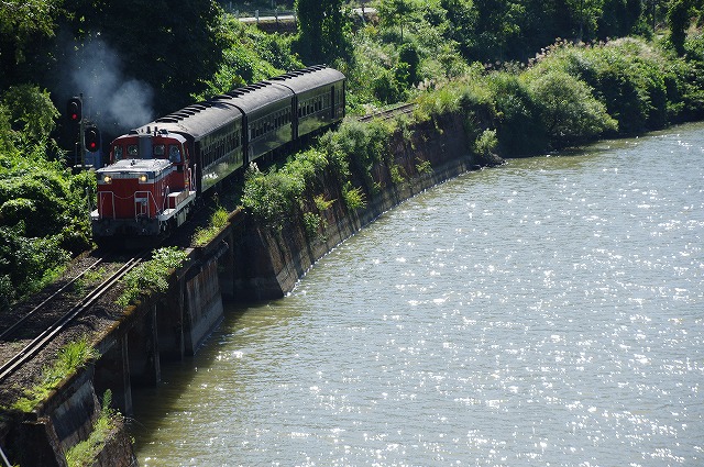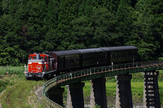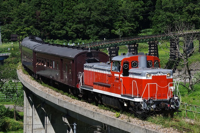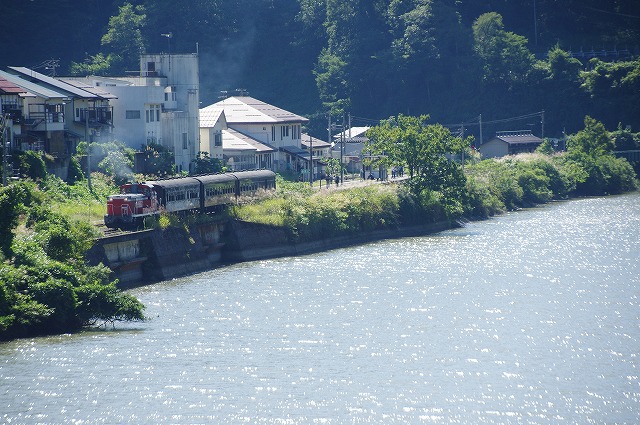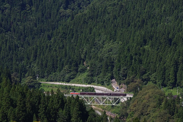 直ぐに撤収とはいえ、下りの登山道に撮影者が連なり、駐車場からの出発も時間がかかり、前方には大型バスそして交互通行多数と絶望的な状況ではあったが、只見手前まで2回追いついて撮影できた。この調子だと本番は1発しか撮れなそうだ。復路の撮影地を確保するため、只見駅への追っかけはせずに場所取りしてから、冷房の効いた車内でコンビニ弁当で昼メシにした。それにしても暑い、夏のようだ。 |
