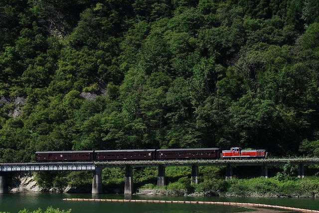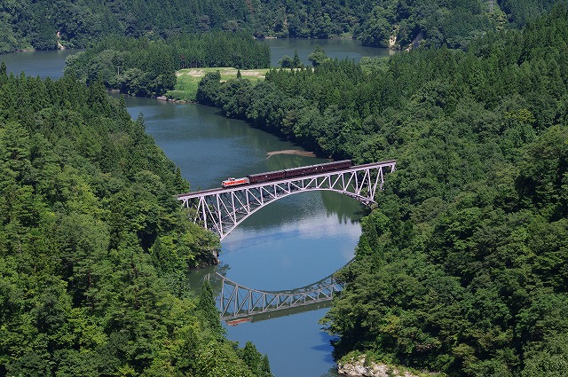 | 10月に運転される只見線全線運転再開記念号の試運転が行われるとのことで、朝3時に会津へ向けて出発した。西日本に大きな台風が接近していて影響が心配だったが、峠を越えて会津地方に入ると青空が広がっていた。8時前に三島の道の駅に到着。満車表示だったがタイミング良く1台が出て行ったので、誘導員の指示に従い駐車した。第一橋梁は初めてだったが同行のSについて整備された登山道を上がり、鉄塔のふもとのベンチがあるところにセッティング、いい感じで水鏡が出ていた。鈍行2本通過後に風が出てきて水面が波打ちだした。雲がいくつか通過しだし、いつもの事と諦めかけていたが、通過前に雲は去り(全部ではないが)風が止み、水鏡が再び現れた。通過時は山の上に雲が残ったが、待望の水鏡は撮影できた。 |