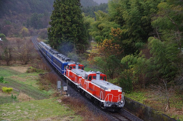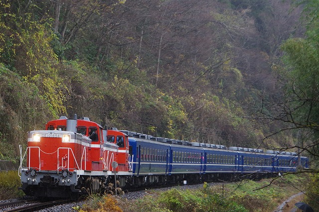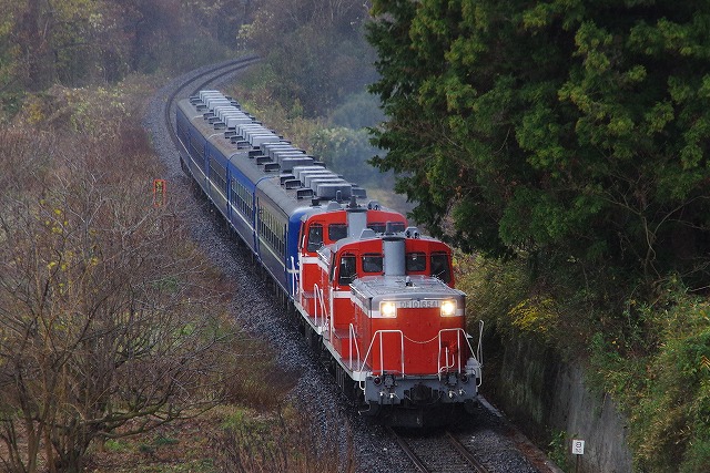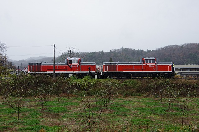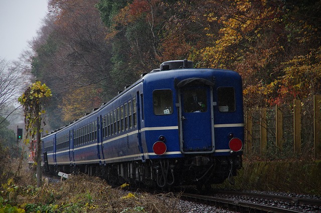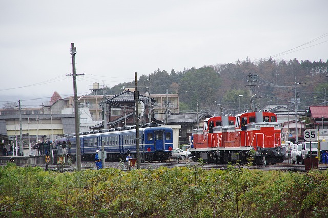 | 本運転の混雑を回避すべく試運転のみ参加。家を4:20発、R4で現地9:50着。早朝の晴れから曇りになり、現地に着く頃には雨が降りだす。キハ30貸切メンバーと待ち合わせした玉川村ストレートはやめて、車で待機出来そうな空いているポイントを探す。西金の手前のキャンプ場跡のカーブは、誰もいなく線路脇なのでここに決める。通過後即撤収し、袋田手前の陸橋へ。追っかけ組の最終ポイントなのでベスポジは雛壇になっていた。その脇で撮影し、玉川村から来たキハ30貸切メンバーと再開して常陸大子駅へ。 |