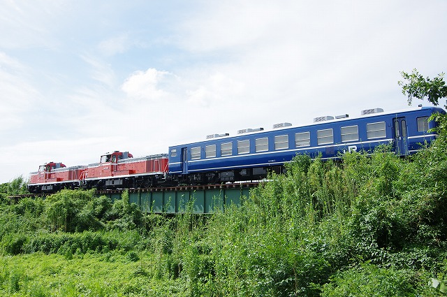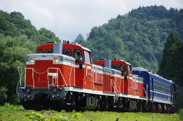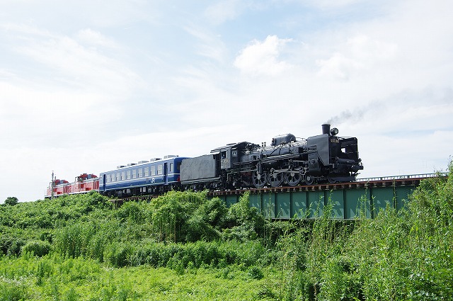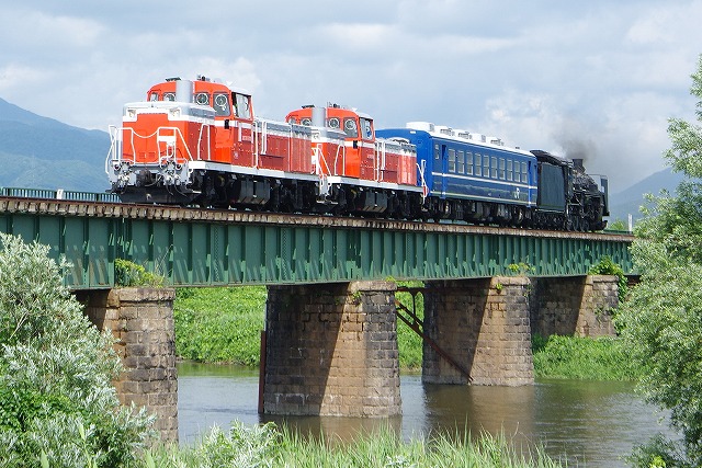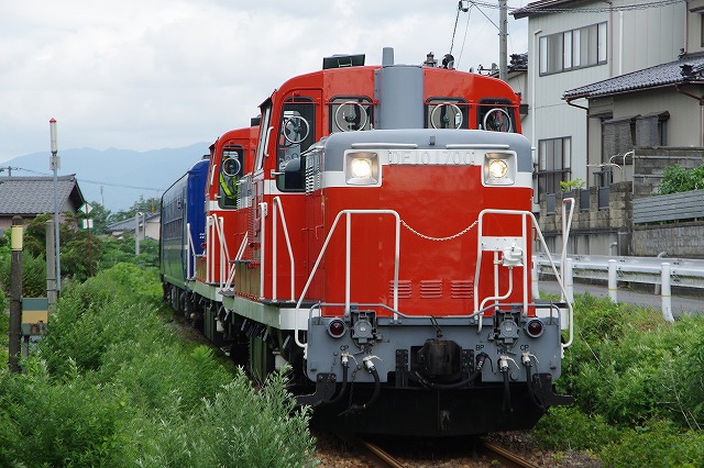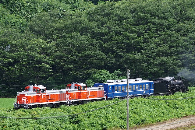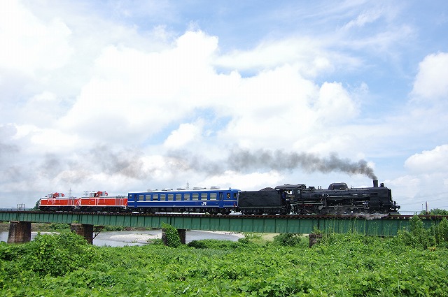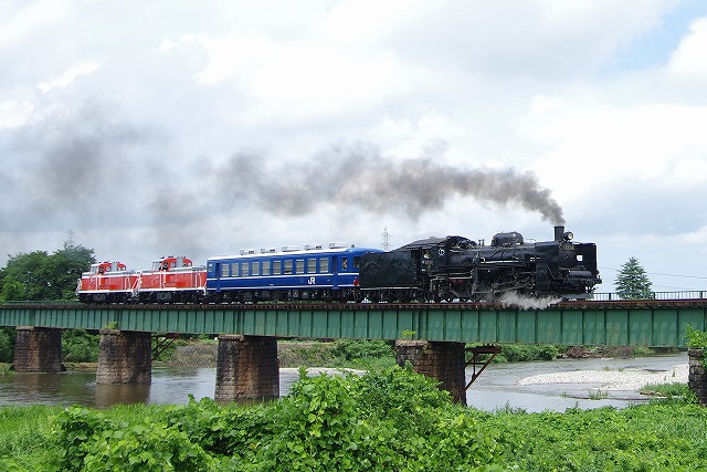 | 磐越西線C57試運転2日目の13日はDE10が2両ぶら下がるという情報を得て、翌14日の東武DE10(DL大樹)会津若松試運転とセットにして出掛けた。12日深夜に家を出発。早朝の只見線朝練を経て、五泉の早出川鉄橋には8時半着。着いたときは雨だったが、天気は徐々に回復し青空も少し見えてきた。汽笛を鳴らしながらC57が通過、追っかけ開始だ。東下条駅付近は草の背が高いため、高速の側道まで上がって見下ろす感じで撮った。往路のラストは、以前撮った事がある三川のトンネル先で待つ。ここは左へ巻いているので、後ろのDE10を隠し、まるで12系客車列車を牽いている感じで撮れた。試運転折返駅の津川駅まで行き、駅でのスナップ写真を撮った。 |