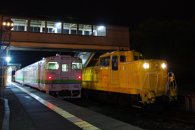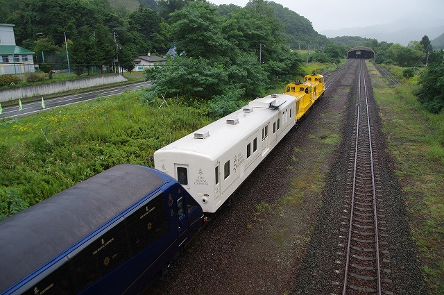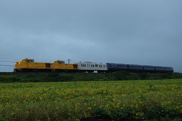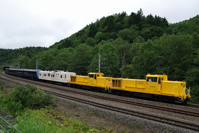 東に向かうにつれ雨の頻度が上がってきたので屋根のある滝ノ上駅をスタート地点にする。コンビニで買ったザンギ丼を食べて待つ。前走りのキハ40単行鈍行で練習した後、ロイヤルエクスプレスが通過。DE15の黄色さが鮮やか過ぎて、いやはや・・・。即撤収し高速経由で追っかけ開始。トマムICで降りて串内信号所へ、20名程がスタンバイ、幸い雨は止んでいた。低速で進入してきた。交換のため停車するが、私は直ぐに出発し、再び高速に乗る。