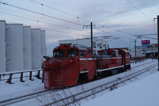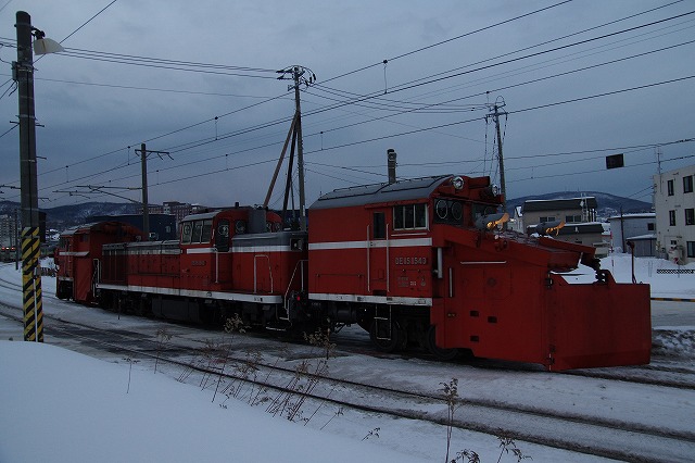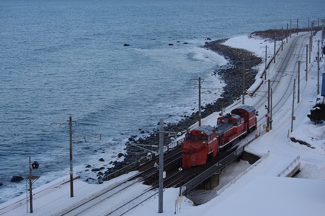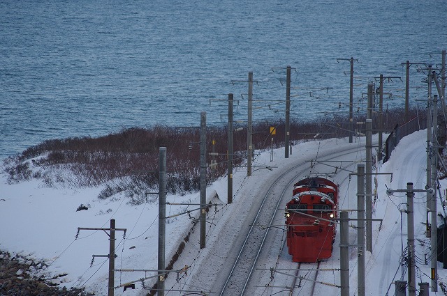 | 天塩中川で宗谷北線撮影を終えて、名寄までの区間はパスした。天塩中川からだと高速利用で、函館本線の海沿いを行くラッセル回送が間に合うことを事前に調べておいたので、高速で一気に小樽を目指した。昼メシも喰わずに朝里の先の海ポイントには15時過ぎ着。 |