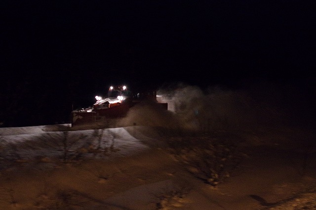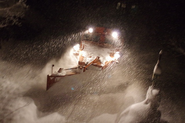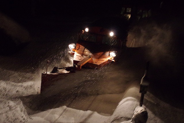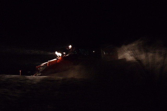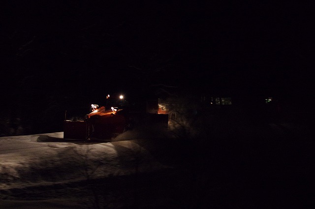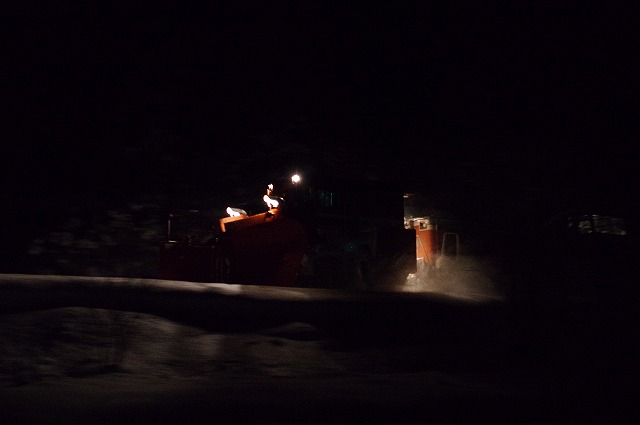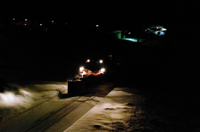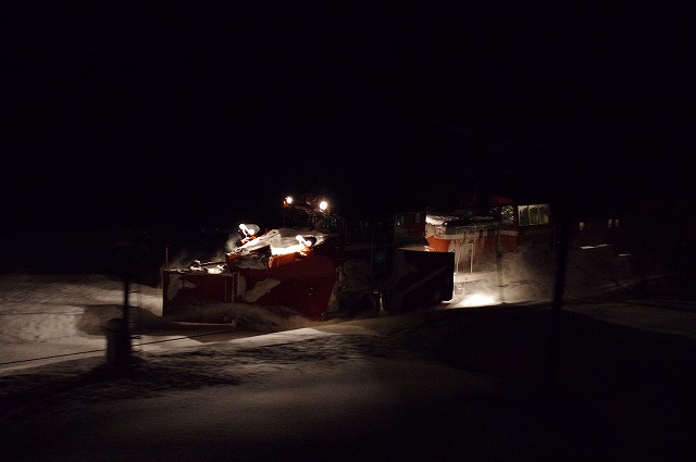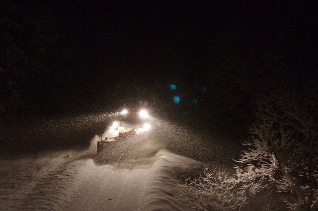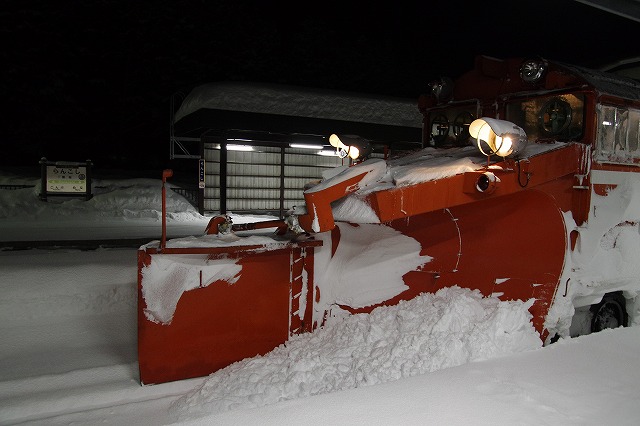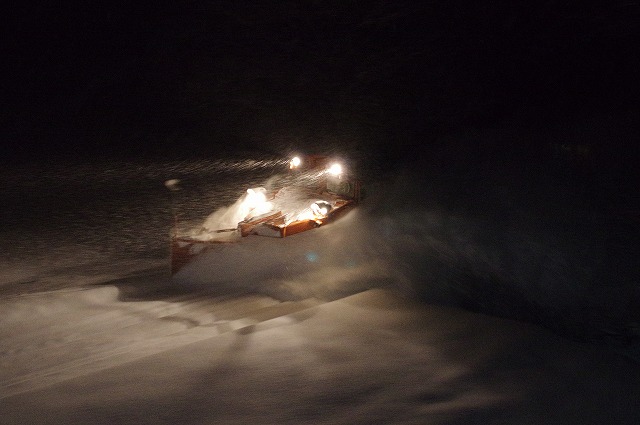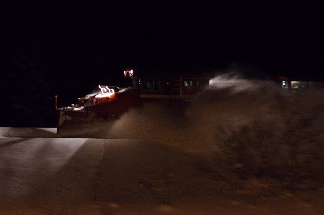 4時にアラームに起こされ目が覚めた。宿の外に出ると雪が積り、車も道路も雪に埋もれていた。道路に積雪があり慎重に走ったので追っかけが厳しく、長万部まで2回だけだったが豪快に雪を飛ばしてくれた。 |