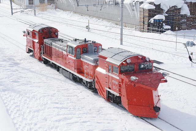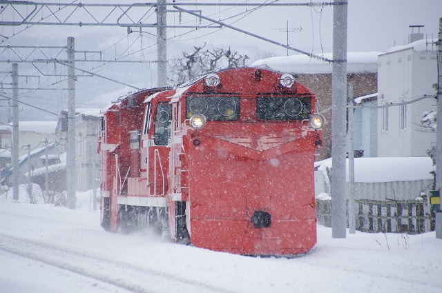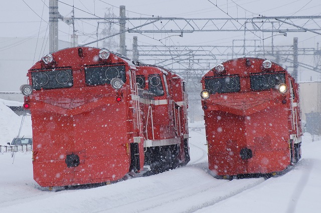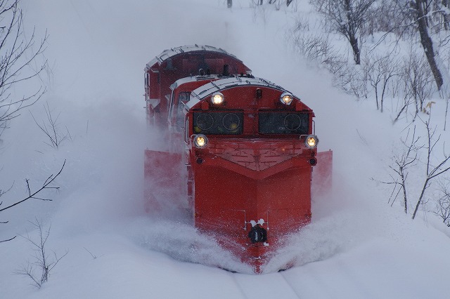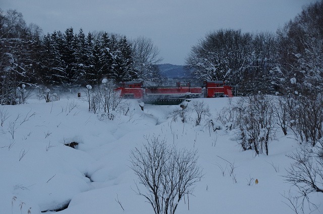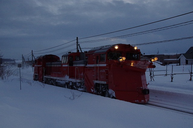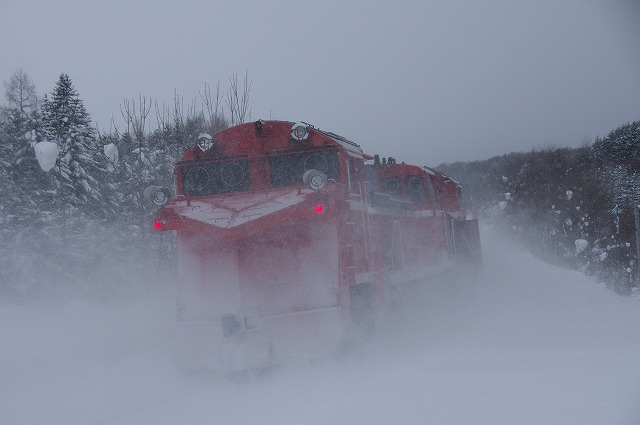 今朝は2:50に起床し、上川へ向かったもののDE15 1535が遠軽あたりで故障したためラッセルは運休で、始発のキハ40単行を追っかけして帰った。宿に戻り、朝メシを食べて温泉で温まり朝寝した。昼前に活動再開し、今日もほとんど降雪無しのため、旭川運転所の確認から、宗谷南線へ行くことにした。昨日は毎回狙っている、複線式と単線式ラッセルのすれ違いは、カスリもしなかったが、昨日のスジを参考に場所を変えてバッチリだった。しかも初の単線式すれ違い。石北も単線式DE15 2511だ。珍しいので、一瞬石北へと迷うが、雪掻かなきゃしゃーないので蘭留へ。バッチし飛ばしてくれた、こーでなくっちゃ。