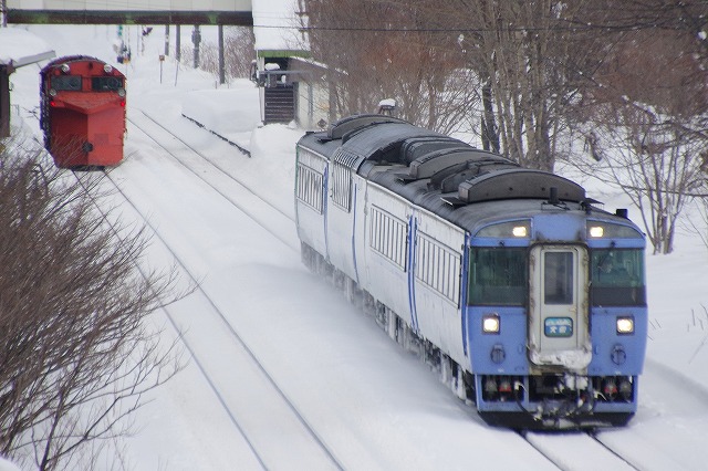 朝練し朝寝後、10時に宿をチェックアウト。ラッセルまで時間があるので、富良野線や特急大雪を撮影し、その合間に来る途中で買った、スープカリーの名店OASIS(オアシス)のテイクアウトを車内で食べて昼メシにした。野菜の甘味がスープに溶け出し、辛さとのハーモニーが絶品だった。14時に旭川運転所付近でラッセルすれ違い期待でスタンバるが、今日はスカ。今年は1勝2敗だった。今日も石北が単線タイプだったので、蘭留で宗谷をやって石北へスイッチする。