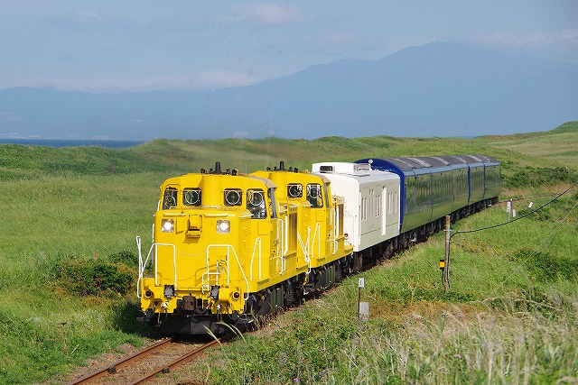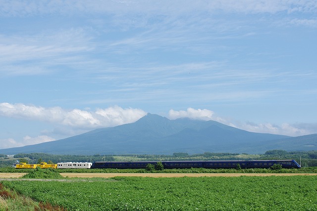 ここから先のダイヤが読めないので、少し急いで川湯温泉を越え斜里方面へ向かう。峠まで曇りで、斜里岳は厳しいかと思っていたら、峠を越えると晴れていた。札弦に13時過ぎに到着。少し雲があったので、斜里岳を隠さないよう祈りながらセイコマの弁当で昼メシ。ロイヤル通過時には少し雲は出ていたが、7年前のマヤ検の時とほぼ同じ景色を見ることができた。網走までのシメは原生花園手前の丘で少しだけ海を入れて撮った。 |