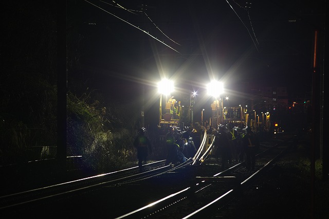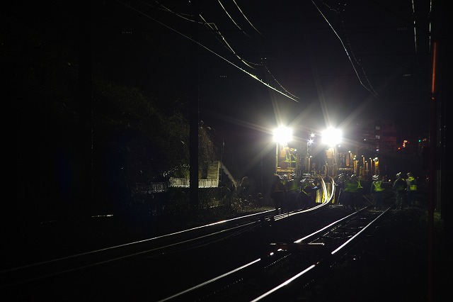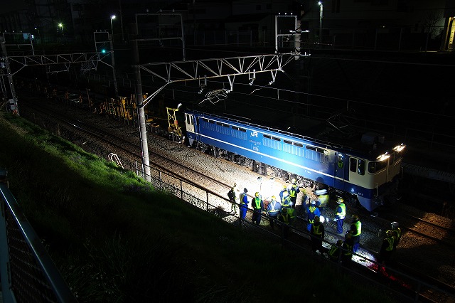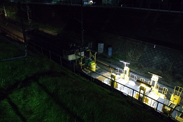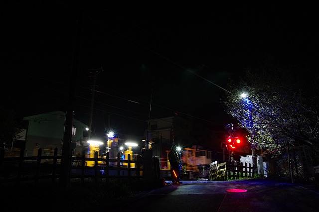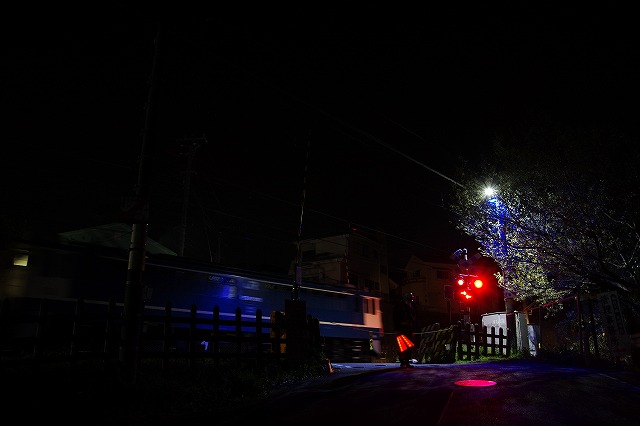 久々の横浜線工臨撮影。今回も近所での作業だ。日付が変わってしばらくしてから出発した。アタリをつけていた踏切に閉鎖の案内が出ていたので待ち構える。撮影者は他1名。PFが踏切の下り線を最徐行で通過し、ロンチキの最後部が抜けて少し行った先で停車し作業開始した。 |