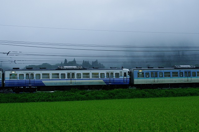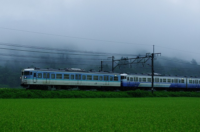 横川工臨を終え、東北本線方面へ向かう前に、オプションを回収に。まずは岡部〜本庄でカシオペア回送。羽越での遅れを引きずっているとの事で遅れ気味で通過。115系配給は小出で狙うため高速に乗った。関越トンネルを抜けると大雨で、小出付近も大雨だった。傘を差しながら、大宮入場に向かう長野色L99編成にサンドされた新潟色N37編成を撮って先を急ぐ。ここから東北本線矢吹付近までは、時間がないため只見の山越えをノンストップで行く。 |