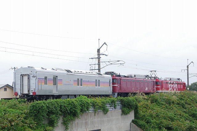 6月の秋田行カシオペア紀行のラストランから3ヶ月、既にE26系(保存車の一部を除く)は長野へ回送され、残るカヤ27と牽引に活躍していたEF81が秋田へ廃車回送されると情報を得て撮影へ。スタートは浜館公園俯瞰。直前まで暴風雨が凄かったが、雨が止み少し明るくなったタイミングで通過。高速を使って雄物川鉄橋へ。