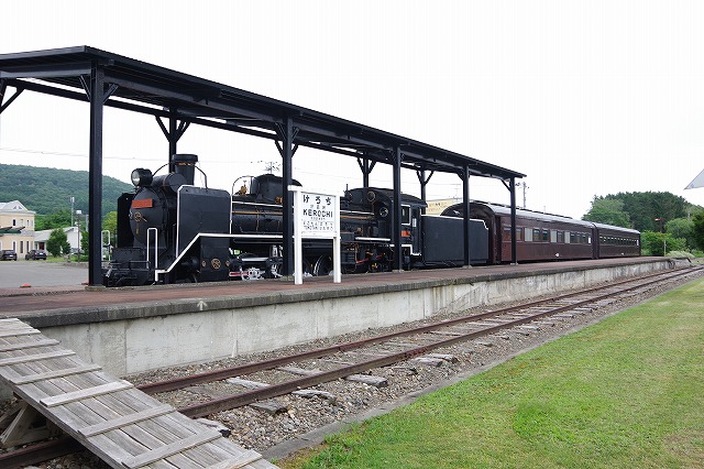 | ロイヤルエクスプレス撮影3日目だが、遠軽駅発着の一発狙いなので時間に余裕があり寄り道。能取湖を5時に出発し、サロマ湖湖畔をのんびりまわり、湧網線計呂地駅跡の交通公園を見学した。営業開始時刻前だが、色々施設が残っていて興味深かった。遠軽駅手前の跨線橋には8時前に着いた。 |