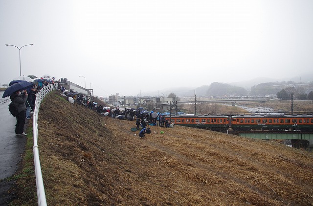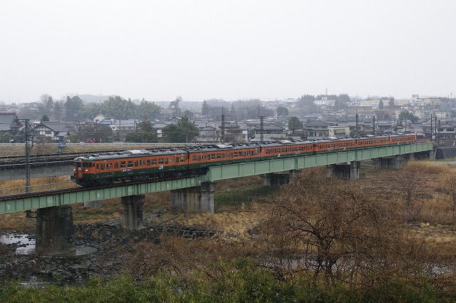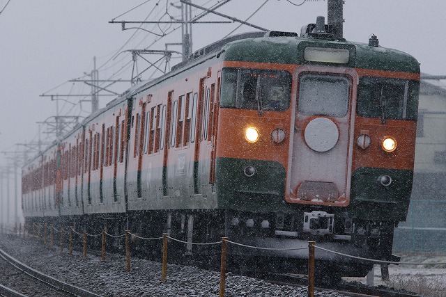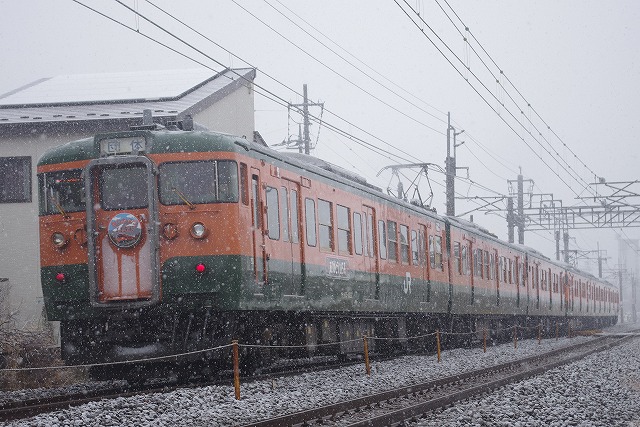 | 草津への家族旅行を計画していたら、同日に115系のさようなら運転があることを知り、通り道だったので少し早起きして下道で群馬へ向かった。安中の鉄橋は曇りから小雪混じりの悪天候にもかかわらず、100名以上の撮影者。少し離れたガラ空きポイントで撮影。復路は雪が強くなり、ヘッドマークが1円玉状態で通過。