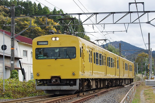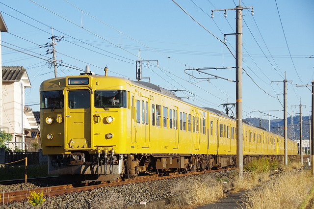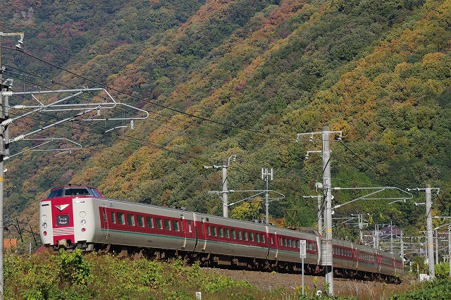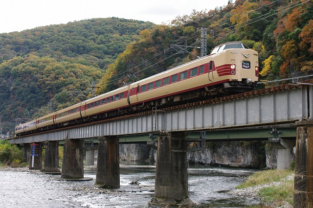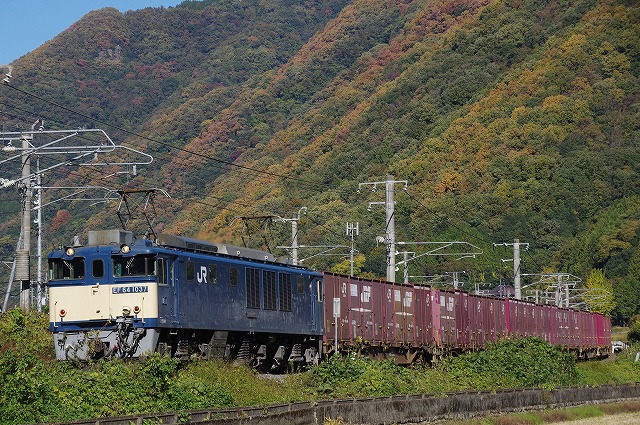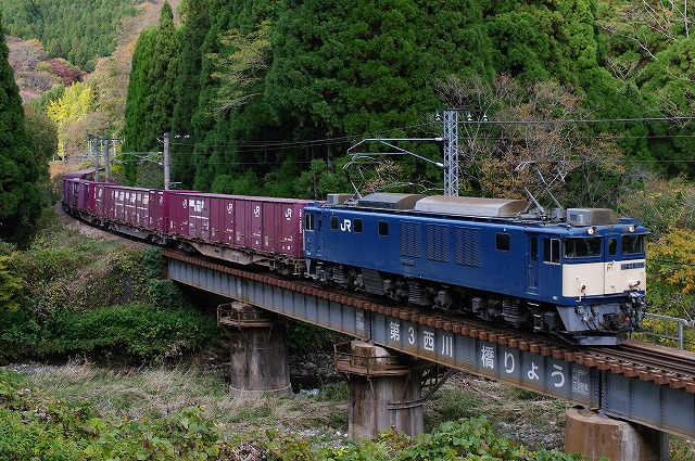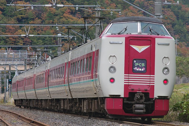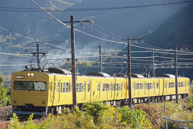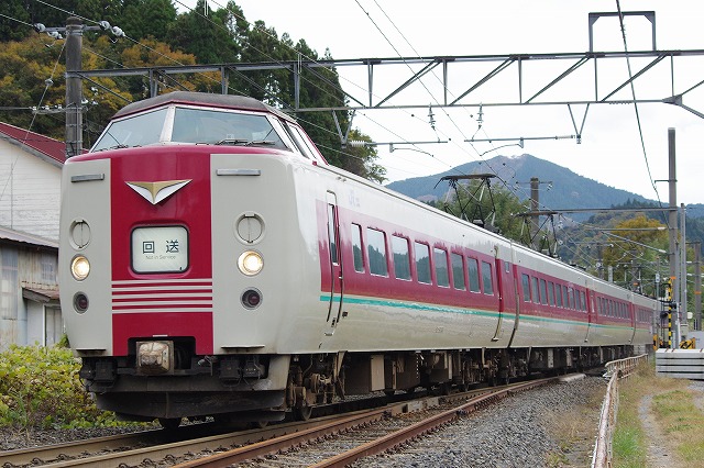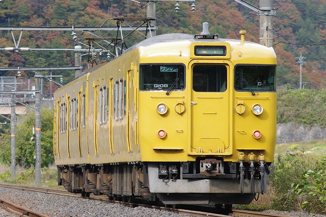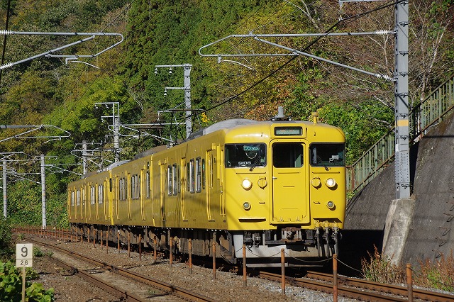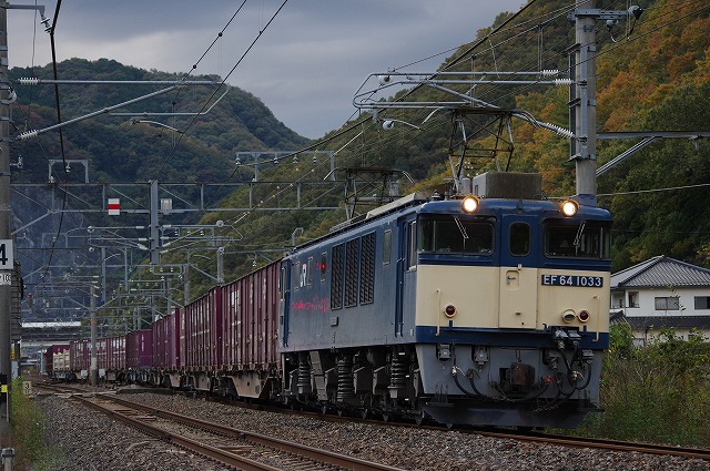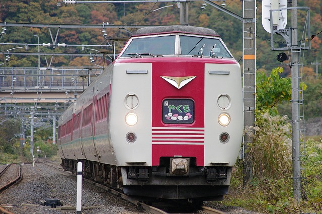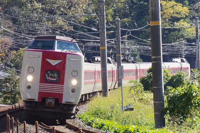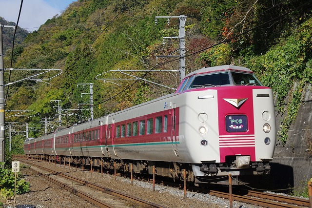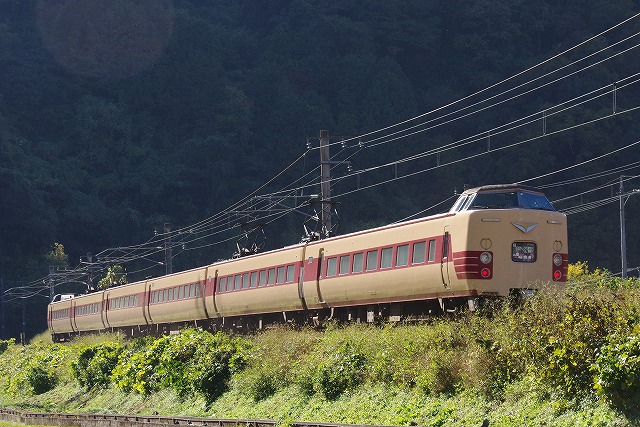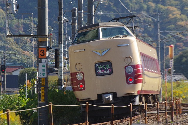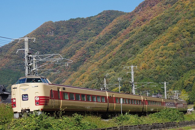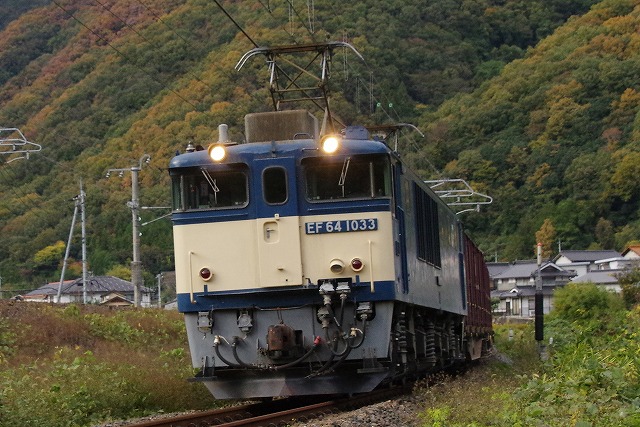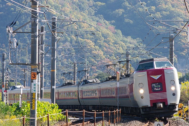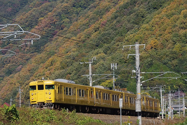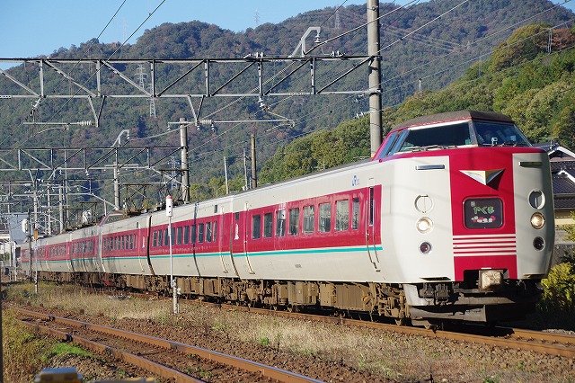 ここで少し余裕ができて、豪渓手前の踏切で朝メシタイム、パンをかじる。上下やくもを撮ってもう少し奥へ。高梁手前の国道より一段高いポイントで上りやくもを。貨物と国鉄色381系の時間が迫ってきたので、紅葉がきれいだった美袋〜備中広瀬のセブン裏で待ち構える。天気はよいが気温が低く冷える。1時間弱で国鉄色381系がやってきた。