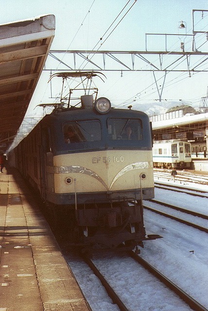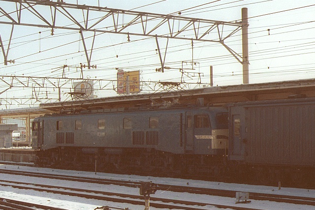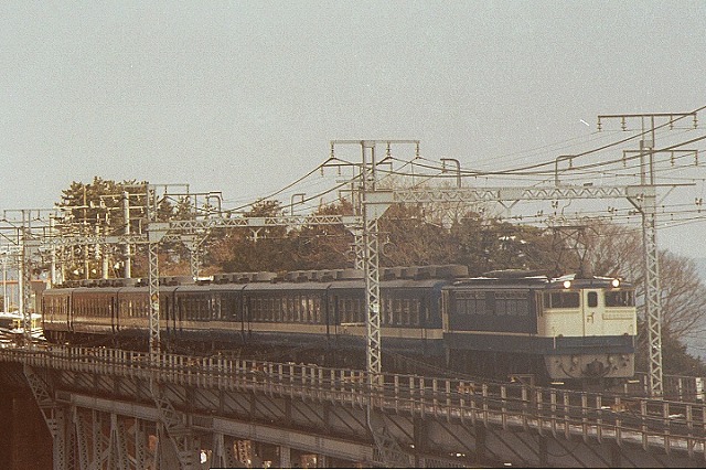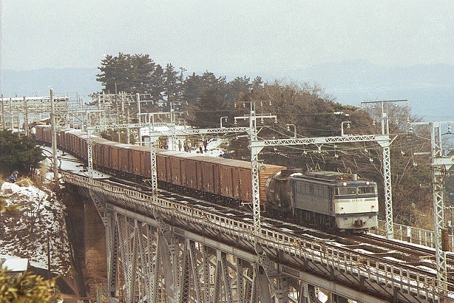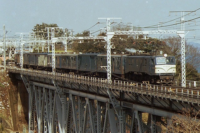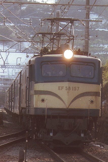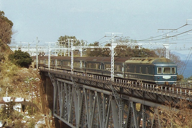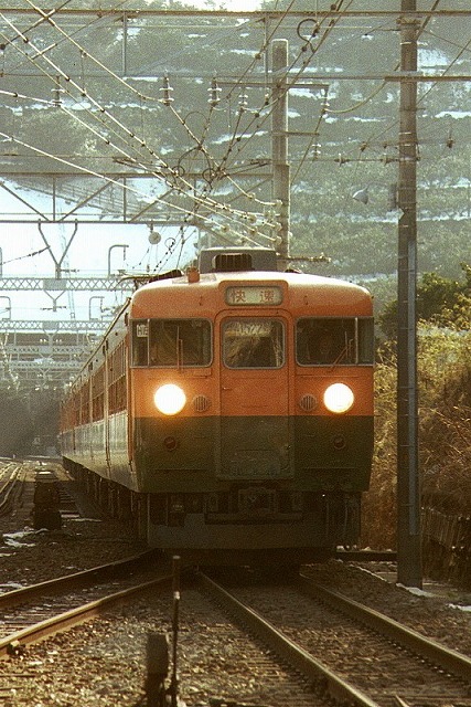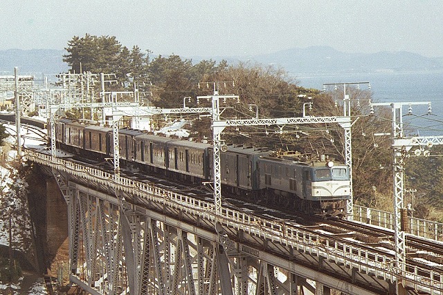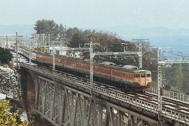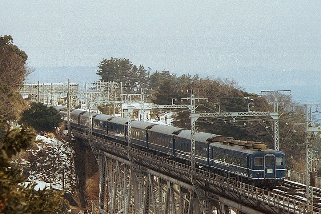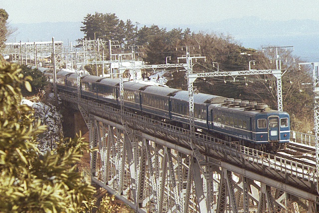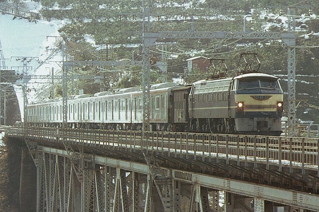 雪で大変だった高校入試翌日の日曜日、ゴハチを撮りに行こうと思い、朝起きた布団の中で晴れてたら根府川、曇りだったら馬入に行くことに。窓を開けると晴れだったので根府川に決定。最寄り駅まで、凍結スリップに注意しながらチャリをこいで、そこからは小田急で小田原へ向かった。小田原駅で丁度上リの荷物列車が停まっていたので急いで東海道線ホームへ。8:39発のモハ113-2109で根府川へ。2日前の雪がまだ残っていて雪景色が撮れた。 |