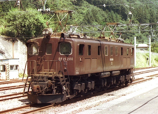 軽井沢YHに一泊し、朝食後駅へ。保存してある10000形アプト式機関車を見学して、バスで鬼押出し経由万座・鹿沢口へ。終点の大前まで行ってすぐ戻る。羽根尾で特急白根の待合せ。工臨のEF15-200が停まっていたので撮る。その後足尾線に乗って帰った。 1泊2日でEF58・62・63・15と保存機EC40で5種類もの珍しい電機を堪能する事が出来た。 |