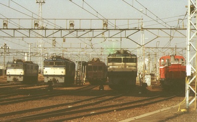 鹿島田駅にはカッパが先に着き、ボーっと立っていた。立ち食いそば屋で、えびかき揚げ天そば210円を食べ(安くてすごく美味かった)腹ごしらえして、クモハ12013を探す。さっきの中原電車区の助役さんとの話中に聞いた小倉橋付近を見回すが留置中のワムやワラしかいないので新川崎方面へ。新川崎駅前の陸橋の品川寄りでEF60やEF65に囲まれてクモハ12013がいるのを見つけたので、歩いているカッパの所へバイクで行き、知らせた。カッパと一緒にクモハ12013に向かって坂を下りて行くと、主任らしき人が来たので「クモハ12013を撮らせて下さい」とお願いすると「以前にけが人が出てそれ以降、全て断っている」と言われてしまった。近くまで行ってもカマに挟まれているので正面しか撮れないので「じゃあせめてここから2・3枚と」お願いしなんとかOKを貰い、望遠で撮って陸橋に戻った。さらにクモハ12をって事で大川支線へ。 |