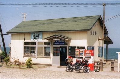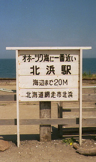 10:19〜44(1885キロ)網走刑務所、単車と乗用車と観光客がすごく多い。門の前で記念撮影し土産屋を見てすぐ出発した。R39を少し走り、10:48〜11:05網走駅、KIOSKで観光タバコ2ケとテレカを買った。R244を斜里方面へ、4車線の広い道だ。左手にずーっとオホーツク海がつづく。11:20(1900キロ)北浜駅着、中を覗くとハイカラな「停車場」という喫茶店になっていた。先月開店したばかりとの事であった。旧型客車の椅子を使ったボックスシートに座り、いもだんご200円を頼んだ。お茶とおもちが運ばれた、すごくやわらかく甘いおもちだ、11:36に釧路行の鈍行が発車して行った。キーホルダーを買って、11:55北浜駅発。