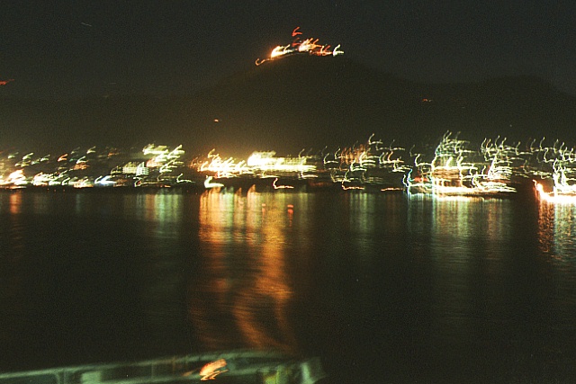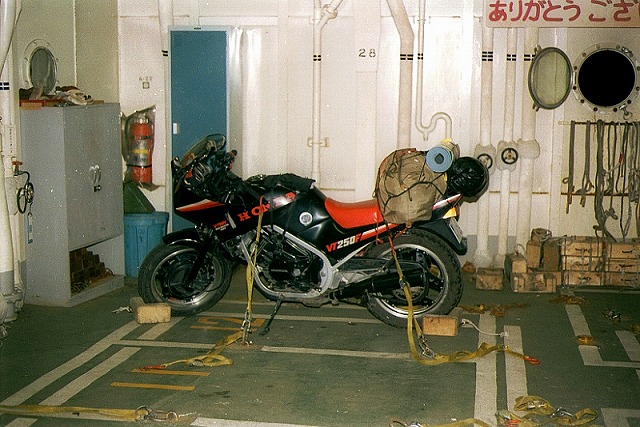 熱く楽しい夏の一日が終わり、18:45北星荘YH着、おばさんにお礼を言って荷物を単車にしばりつける。18:55北星荘YH発、猛スピードでR279を駅へ。19:08(3519キロ)函館駅青函連絡船航送受付所着、もう2分しかないのでダメかと、次の21:40発の申込書を書いていると「19:10のお客さんはもういないかー?」と連絡船のほうから係の人が聞きに来たので「乗りまーっす!」と叫んだら「急いでー」とOKがでて、速攻でエレベーターに向かった。ぐるーっと回りこんで連絡船に乗り12番ってトコに単車を停めタンクバックとサブバックとメットを持って船室に入った。時計を見ると19:18だった、この156便を8分遅らせたのは俺ですスンマセン。 |