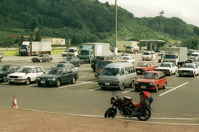 23:00青森港着、接岸作業を待ち固定されていたロープをほどいてもらいKさんと共に出発。23:29(3529キロ)IC、森の中、明りがなく真っ暗。23:50〜53津軽SA三菱GS,給油11リットル入った。すごく長いトンネルを抜けると急に寒くなった。0:26(3615キロ)花輪SA着、マルちゃんのてんぷらそば170円を食べながらKさんと話す、トレーナーを出し着て0:59発。つるんで走るが眠くてたまらん。2:33(3721キロ)柴波SA着、Kさんと別れここで仮眠をとる。Kさんを見送り、マットと寝袋を敷き短パンになってもぐりこむ。即寝で目が覚めたら夜が明けていた、今日も快晴だ。のろのろと寝袋等をしまい、顔を洗いトイレに行きジャンバーを着て出発だ、6:34柴波SA発。クワタバンドのテープを聞きながら快調に走る。8:13〜36(3893キロ)菅生SAで、トイレ休憩。 |