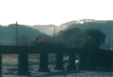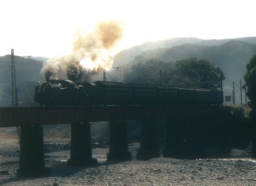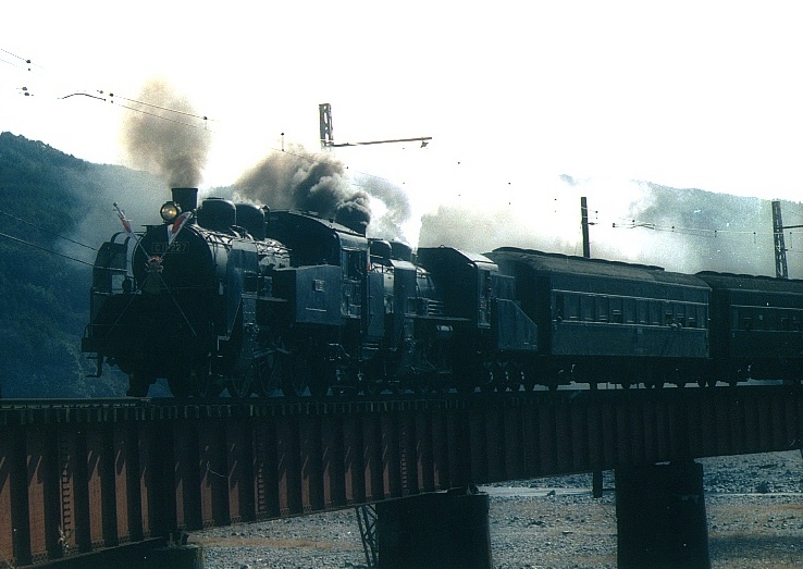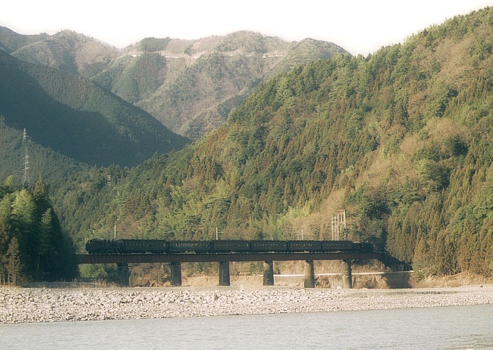 | 崎平鉄橋 上り 急行かわね路号 C11+旧客+C56 (分かりにくいが後向きのプッシュプル) |