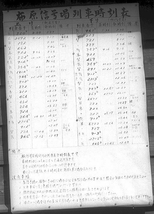 | 布原信号所時刻表 撮影可能時間帯のものと記載がある鉄道ファン向けか? | ||
