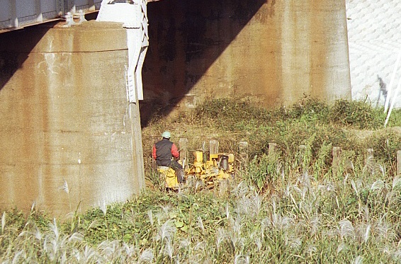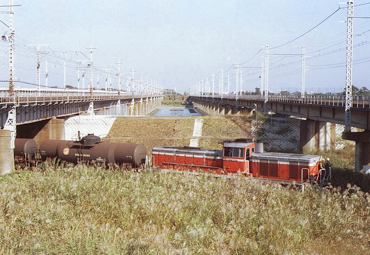 平塚の馬入鉄橋へ撮影に行く度に気になる線路がある。平塚駅の南側東京寄りから東へ東海道本線と併走し、馬入鉄橋の下で東海道本線をくぐり、北上し川沿いを行く線路だ。石油会社の貨物線のようだが、いつも撮影に行くのは土日なので何が走っているのか見た事が無い。平日の13時頃走るらしいという情報を仕入れたので、学校が半日の今日(火曜日)、家から自転車で馬入に向かった。予定より遅れて13:35に平塚の馬入鉄橋着。丁度、引込線をDE11がタキが押して推進運転で駅の反対方向へ下って行ったがフイルムが入ってなかったので撮れなかった。ほぼ同時に貨物線をゴハチの荷物列車も通過して行った。折り返しの上り貨物が駅に戻るのは何時か分からないが、東海道本線を撮影しつつ気長に待つことにする。13:44川の上流で「ピーっ」と汽笛が鳴ったので引込線にカメラを向けて構えているとDE11の牽くタキが駅に向かって上って行った。あっという間に本日の目的が達成出来た。