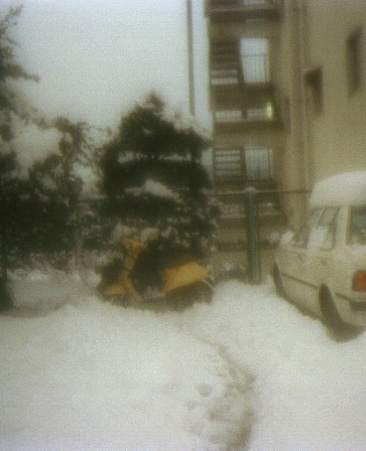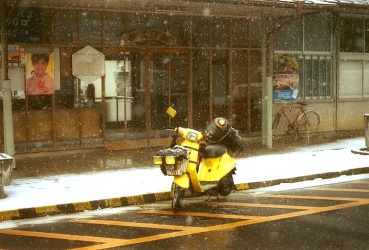 所々でスリップ事故が起きていて、その都度トラックで大渋滞になる。雪は更に強く降り積もり、トラックがそこらじゅうで立往生している。御殿場の先で野良犬が轢かれて雪が血で真っ赤になっていた、一気に眠気が飛んだ。谷峨の2車線が1車線になる所でトラックに巻き込まれそうになったが反対側に倒れた。幸いふかふか雪だったのでダメージは受けなかった。なんとか松田の街に下りたが、積雪もトラックの渋滞も相変わらずなので、さすがの俺もリタイヤだ。4:30(620キロ)松田警察署着、事情を説明して原チャリを置かせてもらう。ヘルメット以外の荷物を持って小田急の新松田駅へ歩いて行った。驚いた事にこんな大雪なのに始発電車は定時に来た。雪の為か電車走行音はせず車内は静かだった。眠気と戦い、地元の駅で降りてチェーンを巻いた乗り心地の悪いバスで家に向かった。家の近くを通る国道はトラックやバスのチェーンの音で騒々しかったが、俺はそんなのをモノともせずに夜までブッ通しで寝た。
