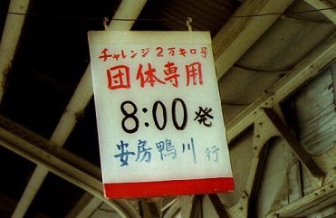 9:00に外房線に入りクイズ大会が始まった。9:24本納で急行外房と交換。10:50クイズ大会終了、優勝は5号車の乗客だった。11:28安房小湊発、あとで使う宝探しの地図をもらう。11:40安房鴨川着、ここで鈍行に乗換えて行川アイランド向かう。列車の待ち時間に駅弁を食べた。13時〜15時半まで行川アイランドで鉄道部品の宝探しをしたり、浜田朱里さんのミニコンサートやフラミンゴショーを見たりした。宝探しでは何も見つけられなかった。鉄道部品即売会で水色のサボを買った。 | |||||||||||||||||||||||||||||||