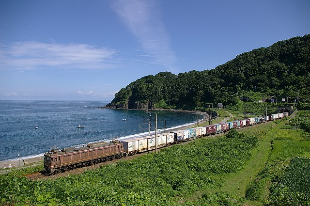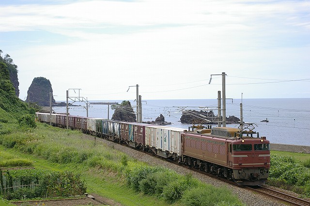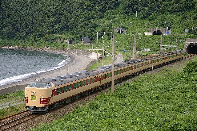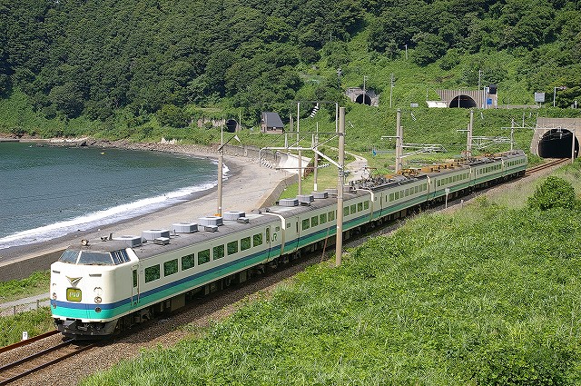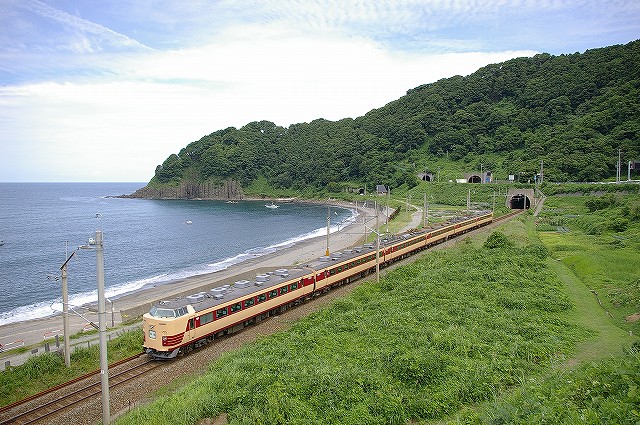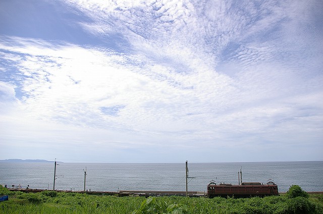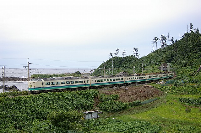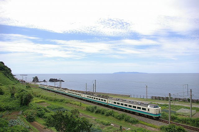 5:40起床、5分でホテルを出る。本日快晴しかも涼しい、夏終了か?6:01発クモハ127-7で新発田へ向かう。発車後新幹線と別れる辺りで湘南色のクモヤ143-51が止まっていた。村上を発車してトンネルを3つくぐると左手に日本海が見えてきた。勝木で降りて485系T18狙いで夕方まで撮影。日本海の見える木陰でのんびり過ごしつつT18を待つ。海の向こうには粟島が見え、俺めがけてカミキリムシが飛んできた、エラく久し振りに見た。