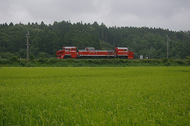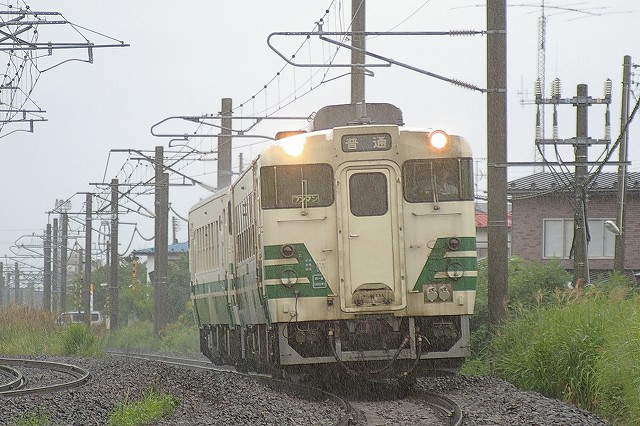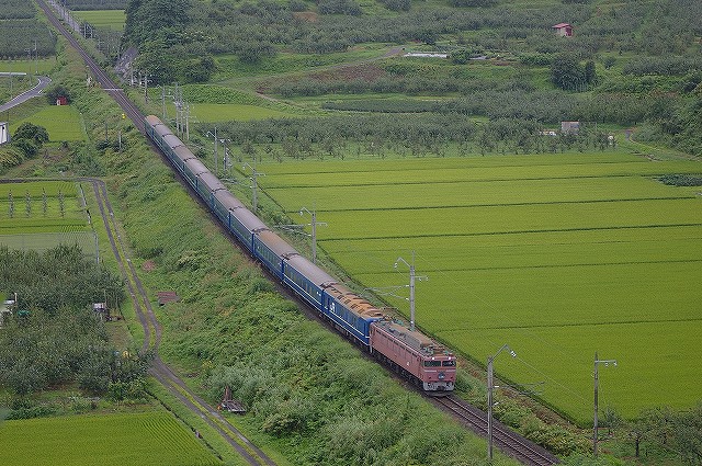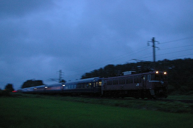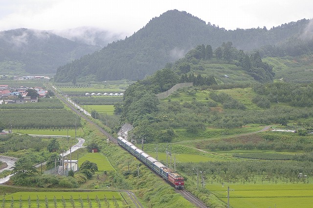 | 4:30起床、今日は秋田で少し時間があるがハードスケジュールだ。蟹田付近の北斗星からスタート。6時過ぎまでに津軽線のED79の赤・青両方撮れたので、大鰐温泉〜石川間の大仏山俯瞰へ。ダイナミックな風景を行く特急日本海と特急あけぼのを雨にうたれつつ撮影する。 |