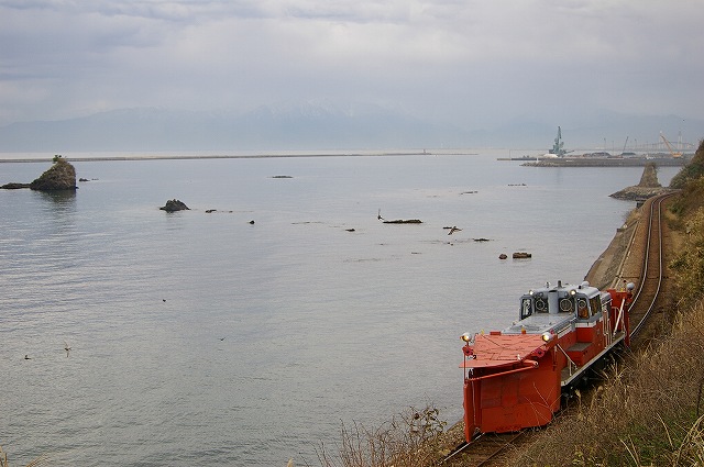 念願の氷見線だ。海とDD15というレアな組み合せだ。天気も午前中は何とか持ち、少しだけ立山連峰も顔を出した。氷見線ラッセル試運転後、氷見線ディーゼルカーと新湊線の貨物を撮影。伏木駅は線路はそのままだが、25年前から大きく雰囲気を変えていた。ヤードの外れにレストア中の車両が停まっていた。 |